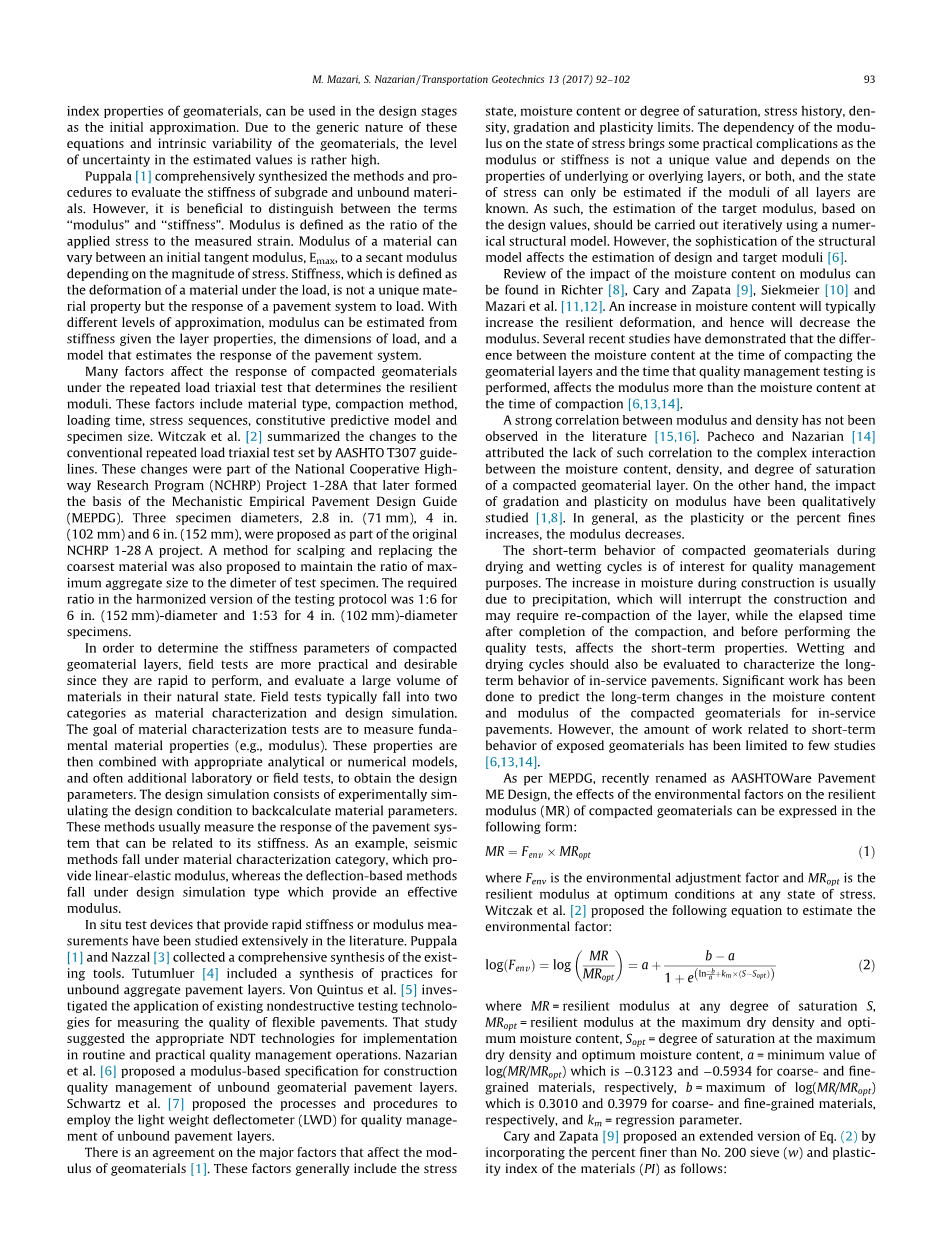 Puppala[1]综合了评估路基和非粘结材料刚度的方法和步骤。然而,区分“模量”和“刚度”是有必要的。模量定义为外加应力与实测应变之比。材料的模量在初始切线模量(Emax)和正割模量(取决于应力的大小)之间变化。刚度被定义为材料在荷载作用下的变形,它不是一种独特的材料特性,而是路面系统对荷载的响应。在不同的近似水平下,模量可以根据层的特性、荷载的大小和一个估计路面系统响应的模型来估算刚度。