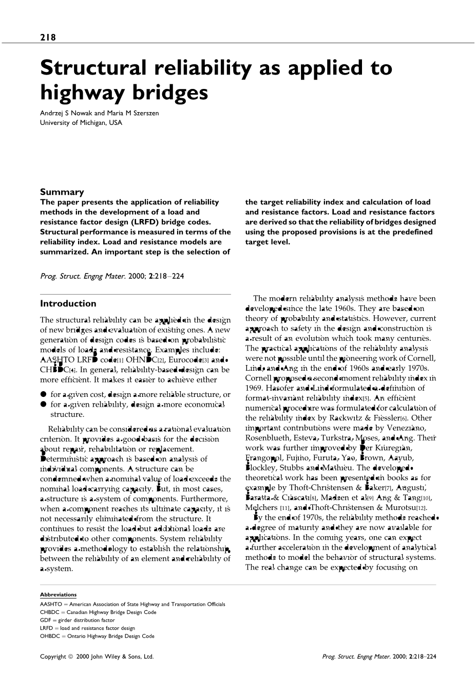该结构的可靠性可应用于既有桥梁的可靠性设计。新一代的设计规范是基于荷载和阻力的概率模型。例如AASHTO LRFD code OHNDC , Eurocode 和 CHBDC 。一般来说,基于可靠性的设计可能更有效。这两个目标都更容易实现