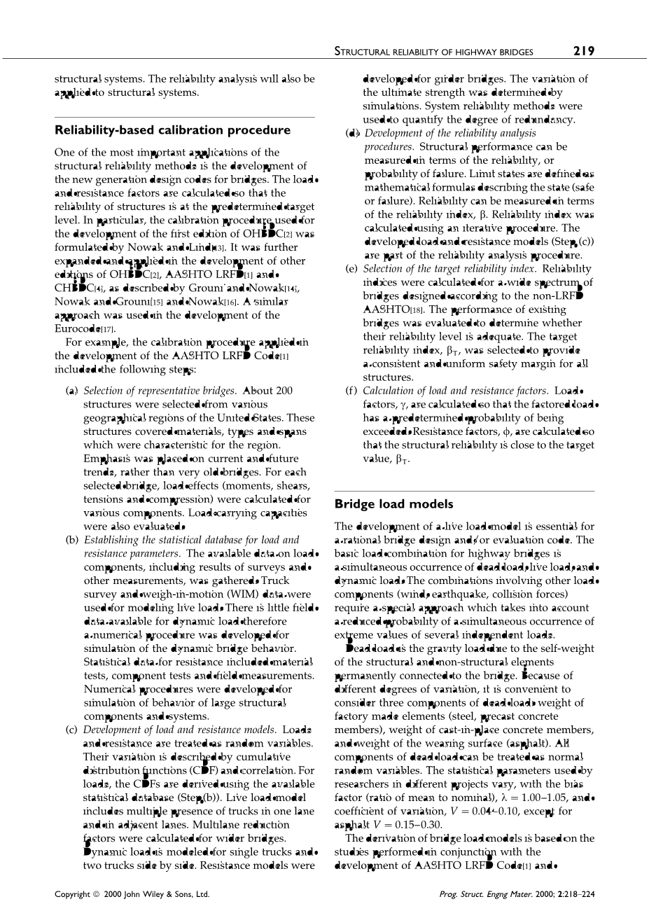 - 负载和电阻模型的开发。载荷和电阻被视为随机变量。它们的变化可用累积分布函数(CDF)和相关系数来描述。对于负载,CDFs是使用可用的统计数据库派生的(步骤(b))。活载模型包括一条车道和相邻车道上的多辆卡车。计算了宽桥梁的多车道缩减系数。对单车和两车并行的动载荷进行了建模。电阻模型用于梁桥。通过模拟试验确定了其极限强度的变化规律。采用系统可靠性方法对冗余度进行了量化。