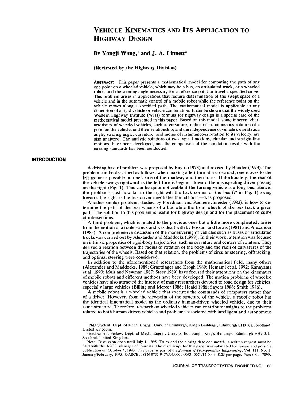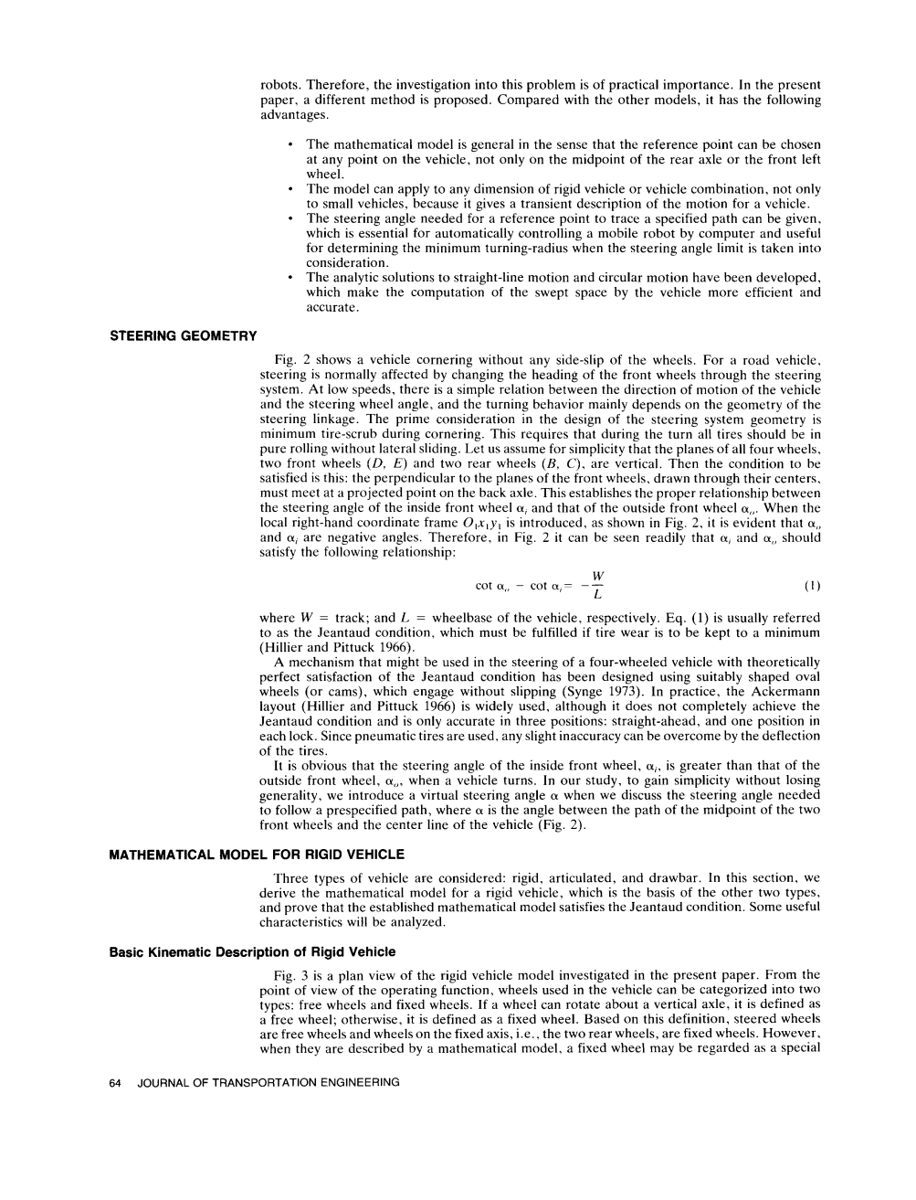 摘要:本文提出了一个数学模型,用于计算轮式车辆上任意一个点的路径,可以是总线、铰接式卡车或轮式机器人,以及参考点行驶指定曲线所需的转向角度。此问题出现在需要确定车辆扫描空间的应用和移动机器人的自动控制中,而车辆上的参考点则沿着指定路径移动。数学模型适用于刚性车辆或车辆组合的任何尺寸。可以看出,西部公路研究所(WHI)公路设计中广泛使用的公式是本文所介绍的数学模型的一个特例。基于此模型,轮式车辆的一些固有特征,如曲率、车辆上点瞬时旋转半径及其关系;分析了车辆方向角度、转向角度、曲率、瞬时旋转半径与速度的独立性。开发了圆形和直线运动两个典型动作的分析解决方案,并将仿真结果与现有标准进行了比较。