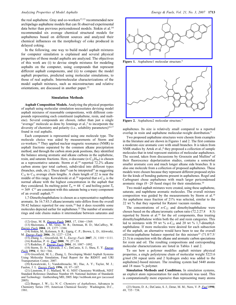 沥青质和树脂的几个平均分子结构已经被提出来了。默多克等人7建立了平均沥青和树脂的分子结构用来分析分子识别 和沥青质聚集的机制。Artok等人8根据实验数据为沥青建立了几个模型结构。后来,Groenzin和穆林斯9基于荧光测量建立了更多的沥青质模型结构。Rogel和Carbognani10基于从不同来源委内瑞拉原油构造了一些沥青质平均结构并且利用分子动力学估计它们的密度。Takahashi等人11使用了三种分子的混合物,以代表海夫吉沥青质的平均模型结构;混合物的结构参数非常接近那些实际沥青质的格雷和他的同事12,13推荐新群岛沥青质模型,可以比以前的城郊浓缩车型更好适合观察到的实验数据。Siskin等人14为基于不同来源的沥青质推荐了6种平均化学结构模型并且分析了它们在延迟焦化的焦炭的形态中的化学影响。