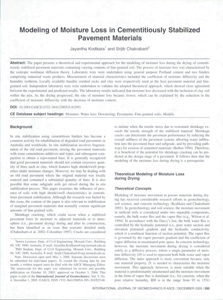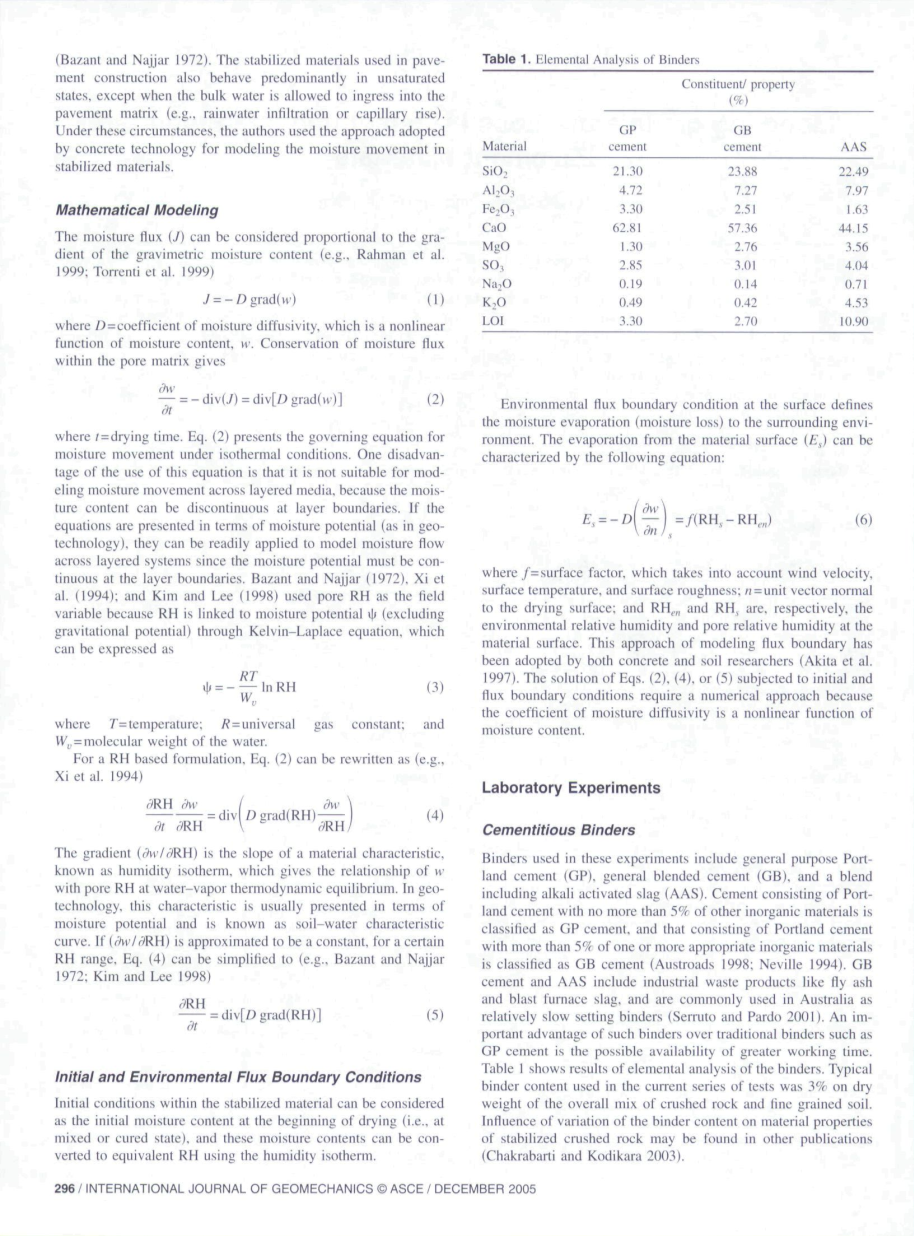 干燥过程中多孔材料中水分运动的模拟已经在地质技术,土壤科学和混凝土技术方面进行了大量的研究工作(Kodikara和Chakrabarti,2001)。在地质技术和土壤科学中,表层土壤中的水分运动被认为是两个可分离的组成部分,即大量水通量和蒸汽通量(例如,Wilson等人,1994)。根据达西定律,体积水通量由水力势(即孔隙水吸力和高度势)梯度和水力传导率控制,水力传导率是吸力势的非线性函数。蒸汽通量由蒸汽压力梯度和不饱和孔隙空间中的蒸汽扩散系数决定。然而,在具体技术中,干燥过程中的水分运动仅被视为一种扩散过程,其中单一的水分扩散系数(D)用于表示大量水和蒸汽扩散。后一种方法更方便,因为只需要一种材料特性D来表征水分运动。然而,当材料主要是不饱和的并且以蒸汽通量形式的水分运动为主时(即,对于混凝土,当孔相对湿度,RH在95%至15%的范围内)时,这种方法更合适( Bazant和Najjar,1972年用于路面施工的稳定材料也主要表现在不饱和状态,除非允许大量水进入路面基质(例如,雨水渗透或毛细上升)。在这些情况下,作者使用了混凝土技术采用的方法来模拟稳定材料中的水分运动。