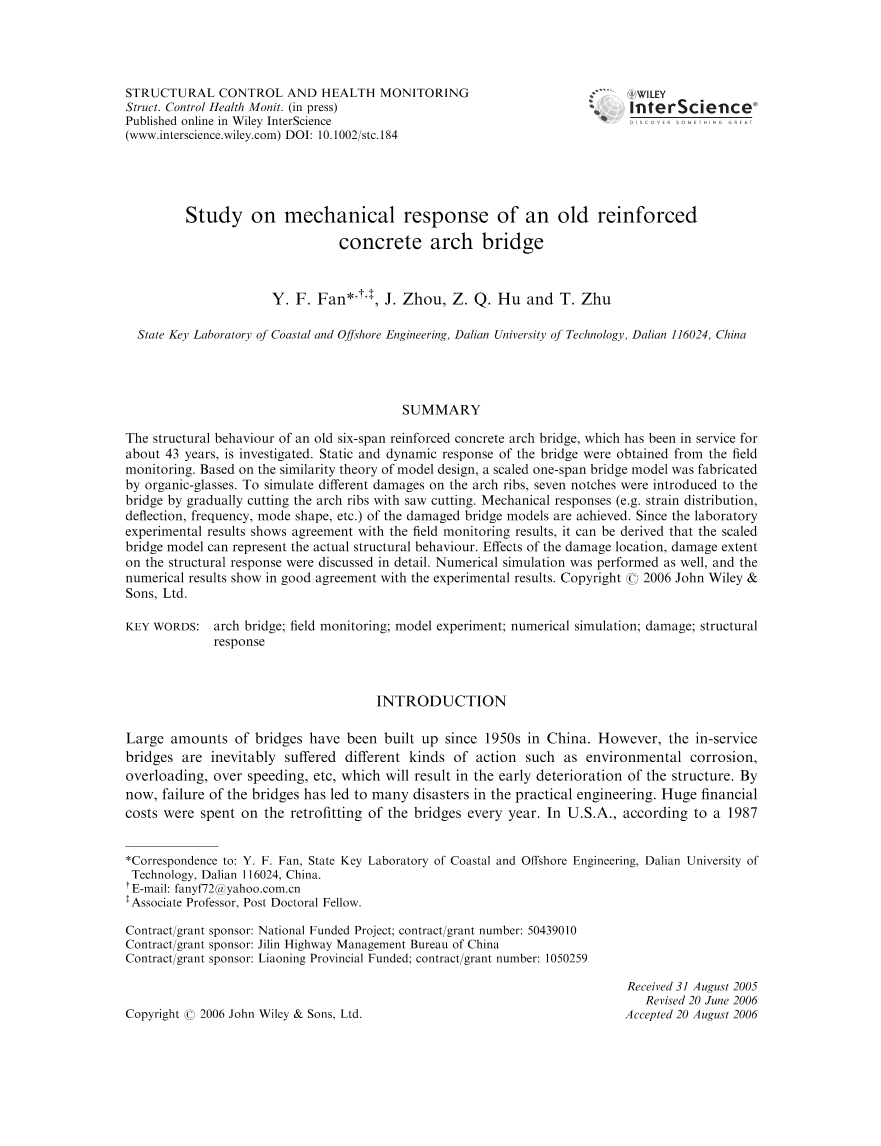 关键词:拱桥;现场监测;模型试验;数值模拟;损害;结构响应