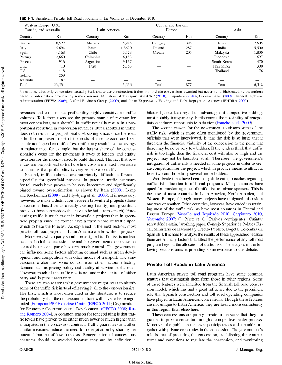 表1.截至2010年12月,世界上重要的私人收费公路项目