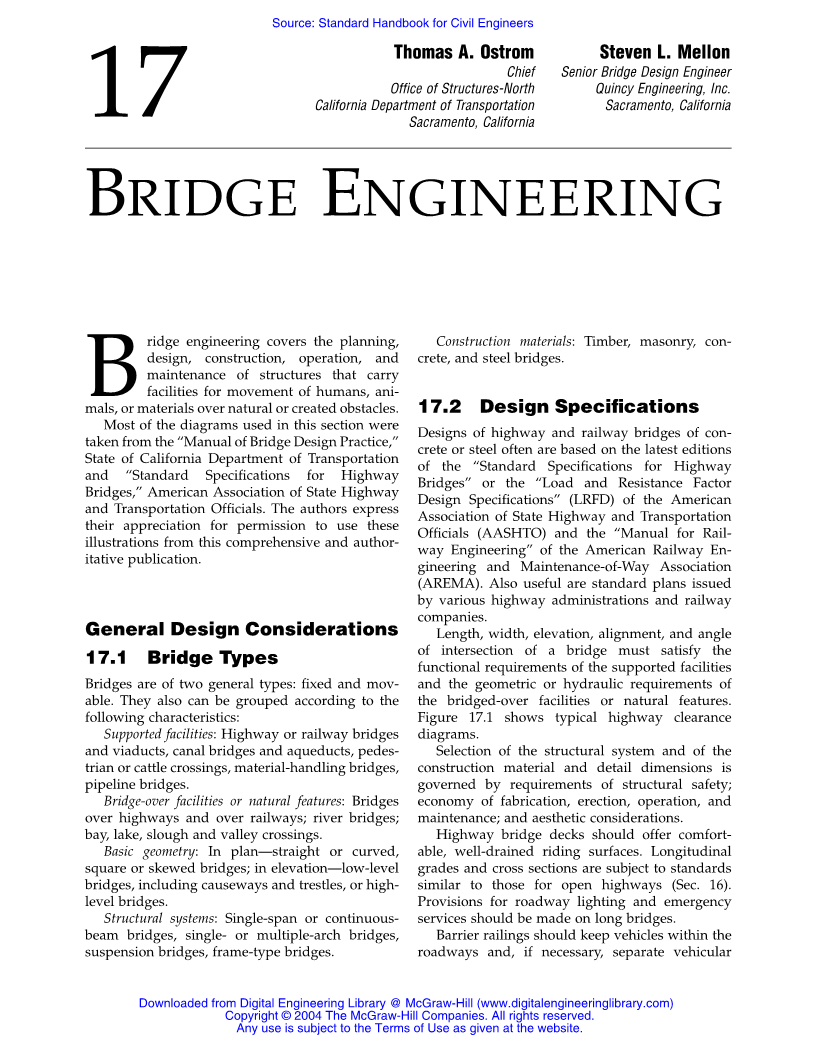 桥梁工程包括规划、设计、施工、操作和维护承载人类、动物或材料在自然或人为障碍上移动的设施。本节中使用的大多数图表取自《桥梁设计实践手册》、加利福尼亚州交通部和《公路桥梁标准规范》、美国国家公路与运输协会。作者对允许使用本综合性权威出版物中的这些插图表示感谢。