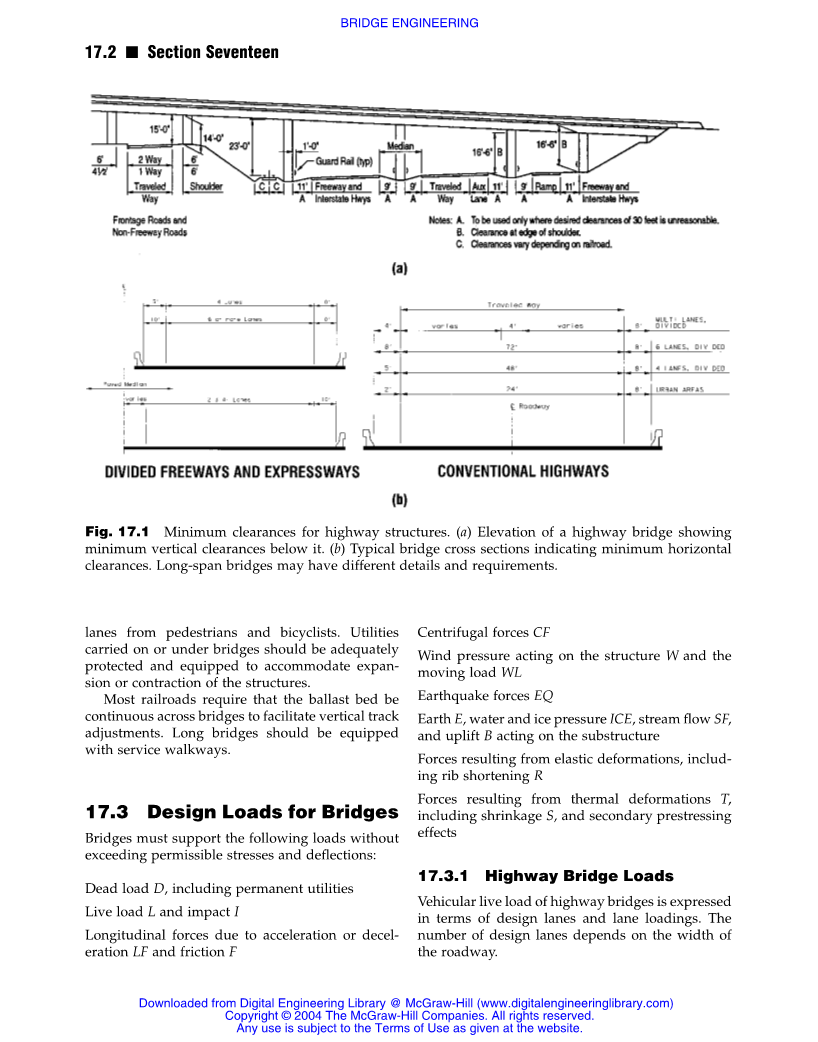 桥梁的长度、宽度、高程、线形和交叉角必须满足受支撑设施的功能要求和跨接设施或自然特征的几何或水力要求。图17.1显示了典型的公路净空图。
