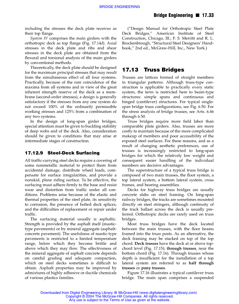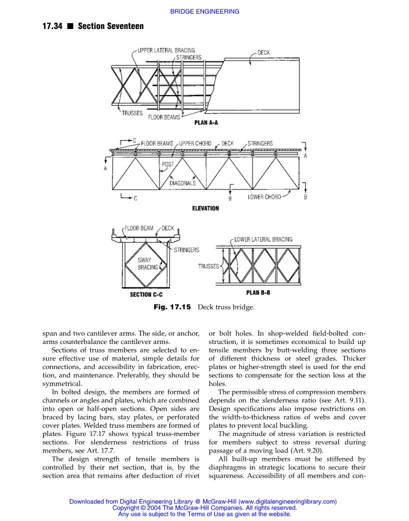 大多数桁架桥的桥面位于主桁架之间,地板梁被框架固定在桁架柱中。作为替代方案,甲板框架可堆放在上弦杆顶部。甲板桁架的甲板位于上弦杆水平或以上(图17.15);穿过桁架,靠近下弦杆(图17.16)。深度不足以安装顶部横向系统的贯穿桁架称为半贯穿桁架或小马桁架。