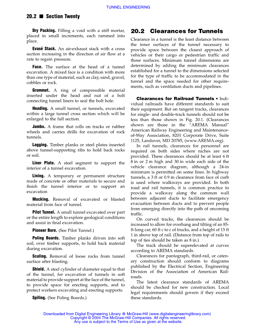 铁路隧道通行许可证:个人铁路有不同的标准,以适应他们的设备。但在切线轨道上,单轨和双轨隧道的间隙不应小于图20.1所示的间隙。(显示的清单是“AREMA手册”美国铁路工程和维护协会,8201 Corporate Drive,Suite 1125,Landover,MD 20785,(www.AREMA.org)中的清除。