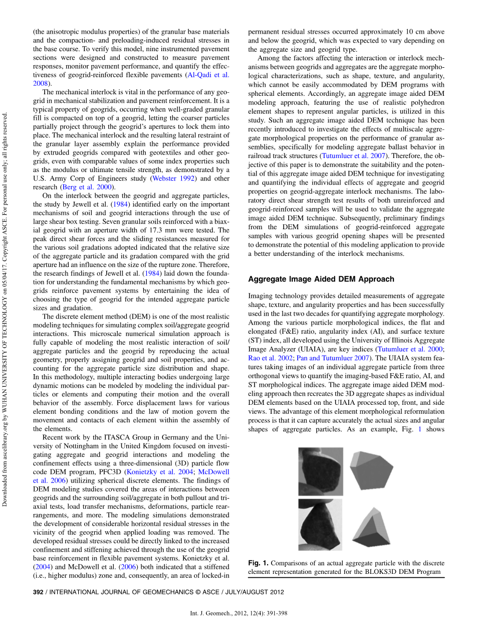 影响土工格栅和骨料之间的相互作用或互锁机制的因素是骨料形态特征,例如形状,纹理和角度,这些都不能通过具有球形元素的DEM程序容易地适应。因此,在本研究中使用聚合图像辅助DEM建模方法,其特征在于使用逼真的多面体元素形状来表示角粒子。最近引入了这种聚合图像辅助DEM技术来研究多尺度聚集体形态特性对颗粒组件性能的影响,特别是用于模拟铁路轨道结构中的骨料压载物行为(Tutumluer等人,2007)。因此,本文的目的是论证这种集料图像辅助DEM技术在研究和量化集料和土工格栅特性对土工格栅-集料互锁机制的个体效应方面的适用性和潜力。随后,将展示具有各种土工格栅开口形状的土工格栅加筋骨料样品的DEM模拟的初步结果,以证明该建模应用的潜力,以更好地理解联锁机制。