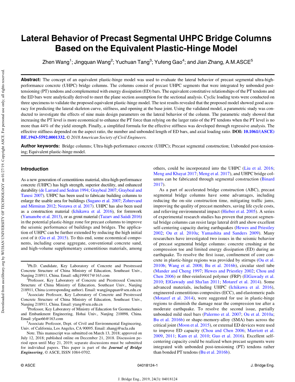 作者关键词:桥柱;超高性能混凝土(UHPC);预制节段结构;无粘结后张紧;等效塑料铰链模型。