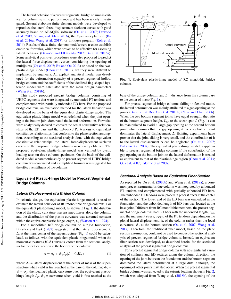 对于在弯曲模式下失效的预制节段桥梁,横向变形主要归因于节点处的间隙开口((Bu et al. 2016b; Ou et al. 2010b; Chou and Chen 2006)。当两个底部节段的强度相等时,底部节段高度与剪切跨度L相近。可以操纵以避免在第二底部接头处开出大间隙,这确保了在最底部接头处的间隙开口主导侧向位移。现有实验证明,关节滑动非常小,其横向位移可以忽略不计(Ou et al. 2007; Palermo et al. 2007)。等效的塑料铰链模型适用于如果底部接头处的间隙开口对横向变形的贡献被视为等同于塑性铰链区域的贡献,则可以预制节段桥梁柱(Chou et al. 2013; Ou et al. 2007; Palermo et al. 2007)。