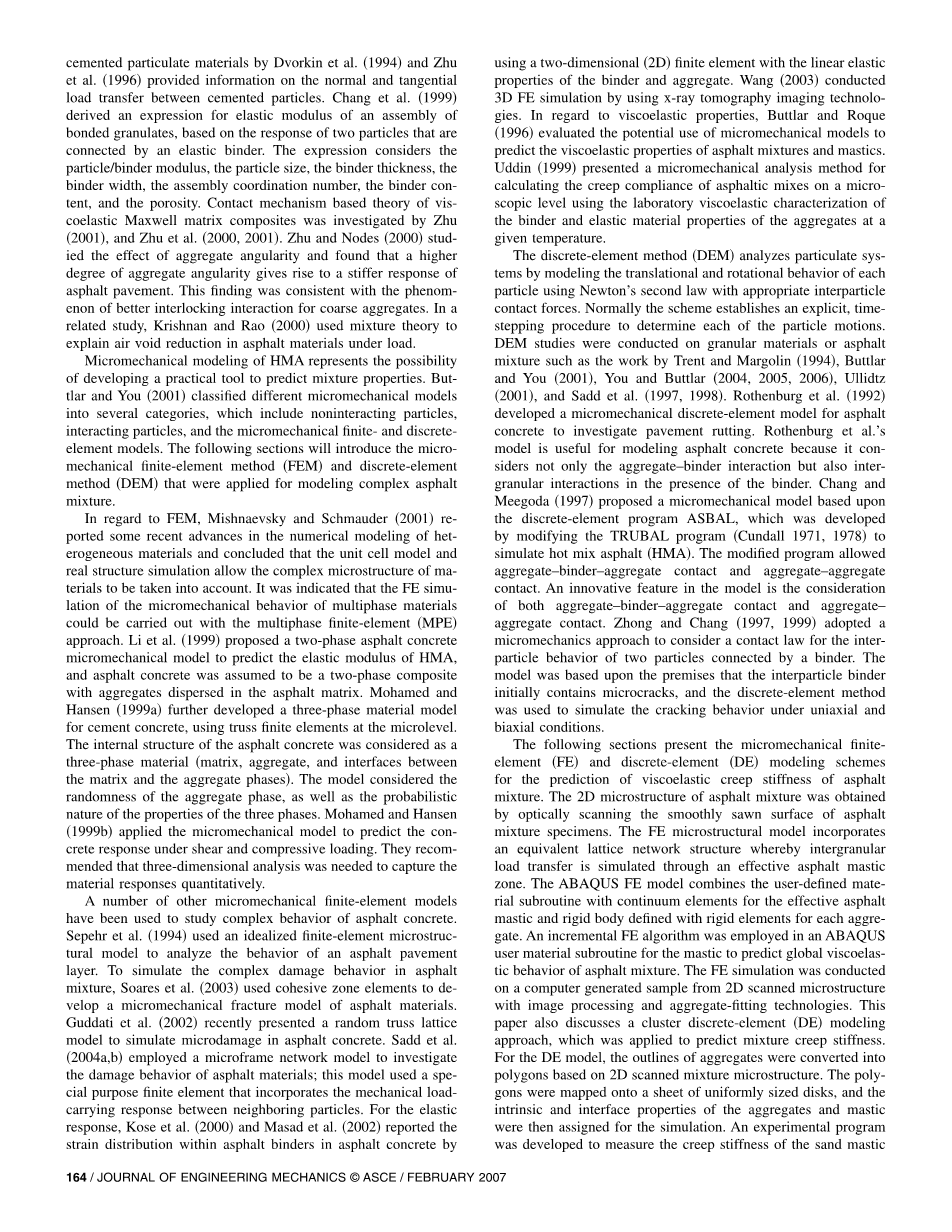 基于混合料相的组成,一些研究人员已经开发出细观机械模型去预测混合料的基本性质。例如,沃金和朱教授等人研究的水泥颗粒材料,提供出水泥颗粒之间正向和切向荷载传递的信息。张等人基于由弹性粘结剂连接的两个粒子,推导出了粘结颗粒的弹性模量表达式。该表达式考虑了颗粒/粘结模量、粒径、粘结厚度、粘结宽度、装配配位数、粘结剂含量和孔隙率。朱和朱等人研究的接触机制是基于麦克斯韦粘弹性复合理论,朱和毛德斯研究的是集料棱角的影响,发现较高的集料棱角度数能够引起沥青路面的强烈反应。这个发现与粗集料能更好的相互作用现象是一致的。在一项相关研究中,克里希南和饶等人用混合理论解释了在荷载作用下的沥青材料空隙减少。热拌沥青混合料的细观力学模型代表了发展预测混合料性能实用工具的可能性。巴特勒和尤两人将不同的细观力学模型划分为几个类别,其中包括不相互作用的粒子,相互作用的粒子,以及细观力学的有限和离散元模型。下面的章节将介绍适用于复杂沥青混合模型的细观力学有限元方法和离散元法。