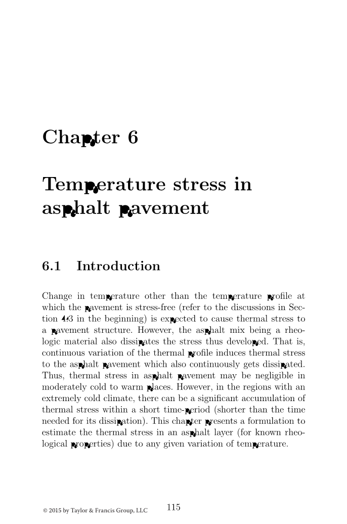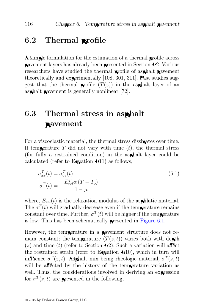 在路面没有压力的情况下,温度的变化(参考第4.3节的讨论)预计会导致路面结构的热应力。然而,作为流变逻辑材料的沥青混合物也抵消了由此产生的应力。也就是说,热力过程的连续变化会对柏油路面产生热应力,沥青路面也会不断消散。因此,在中等温度到温暖的地方,沥青路面的热应力可以忽略不计。 然而,在气候极端寒冷的地区,在短时间内(短于其消散所需的时间),热应力可能会显着积累。 本章介绍了一种公式,用于估算由于温度变化而引起的沥青层中的热应力(对于已知的流变性质)。