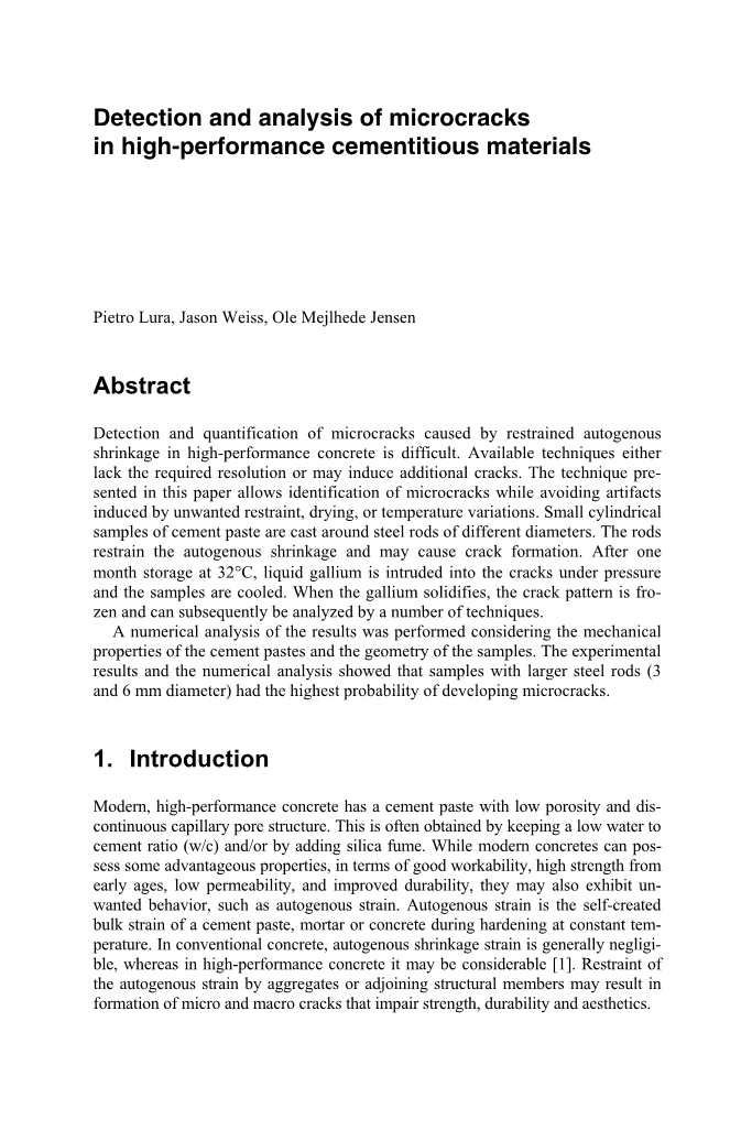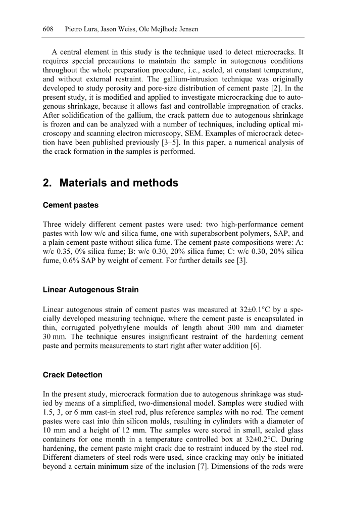 本研究的一个核心是用于检测微裂纹的技术。在整个制备过程中,需要采取特殊的预防措施来保持样品的自生状态,即密封,恒温,无外部约束。镓侵入技术最初是为了研究水泥浆体的孔隙度和孔径分布而发展起来的。在本研究对自收缩微裂纹进行了改进,并将其应用于微裂纹的研究,因为它允许快速、可控地浸渍裂纹。盖瑞固化后,由于自收缩引起的裂纹模式被冻结了,可以用光学显微镜和扫描电镜,扫描电镜等多种技术来分析。微裂纹实例 “论断”以前已经出版。本文对试样中裂纹的形成进行了数值分析。