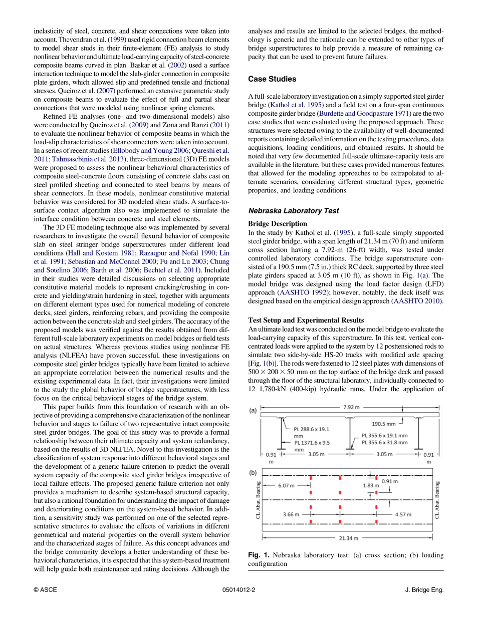 对一个简单支撑的钢梁桥(Kathol et al. 1995)和四跨连续组合梁桥(Burdette和good1971)的现场试验进行了全面的实验室调查,这两个案例研究是用所建议的方法进行评估的。之所以选择这些结构,是由于其提供了详细的报告,其中包含了关于测试程序、数据获取、装载条件和取得结果的详细信息。值得注意的是,在文献中很少有完整的最终容量测试,但是这些案例提供了大量的特性,使得建模方法可以根据不同的结构类型、几何属性和加载条件推断出不同的场景。