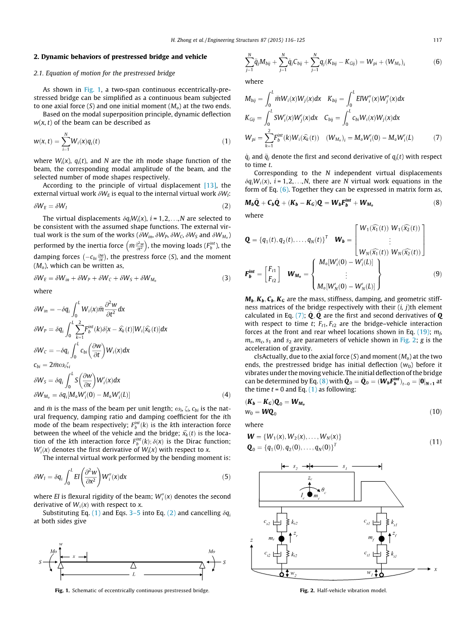 目前,车桥耦合已经有了许多研究成果。Zhu和Law研究了连续梁桥和车辆的耦合作用,他们利用正交板理论和模态叠加技术,分析了在不同车道上的单车或多车在不同车道上作用时桥面的动力情况。不同车辆行驶速度下的动态冲击系数也得到了总结。Yang和Papagiannakis研究了组合梁桥和车辆的耦合作用,并发现桥梁采用FRP(纤维增强复合材料)的桥面铺装会提高桥梁动力冲击系数。Green和Cebon研究了公路桥梁对重型车辆载荷的动力响应,并在桥梁跨中位移动态变化的实时测量和桥梁跨中位移的预测研究上取得了较完善的成果。Kocaturk和Simsek用建立Lagrange方程的方法,解决了简支梁受到偏心压力和简谐运动的集中力作用时的动力响应。Khang等人通过使用子结构的方法,研究了在移动荷载的作用下,预应力连续梁的横向振动,但并没有考虑偏心预应力作用。Cai等重点研究了采用动力冲击系数对桥梁性能评价的影响以及风、桥梁计算跨径对车桥耦合的响应作用。但是,偏心预应力作用对连续梁桥和车辆的动力响应的影响在上述研究中并没有得到开展。