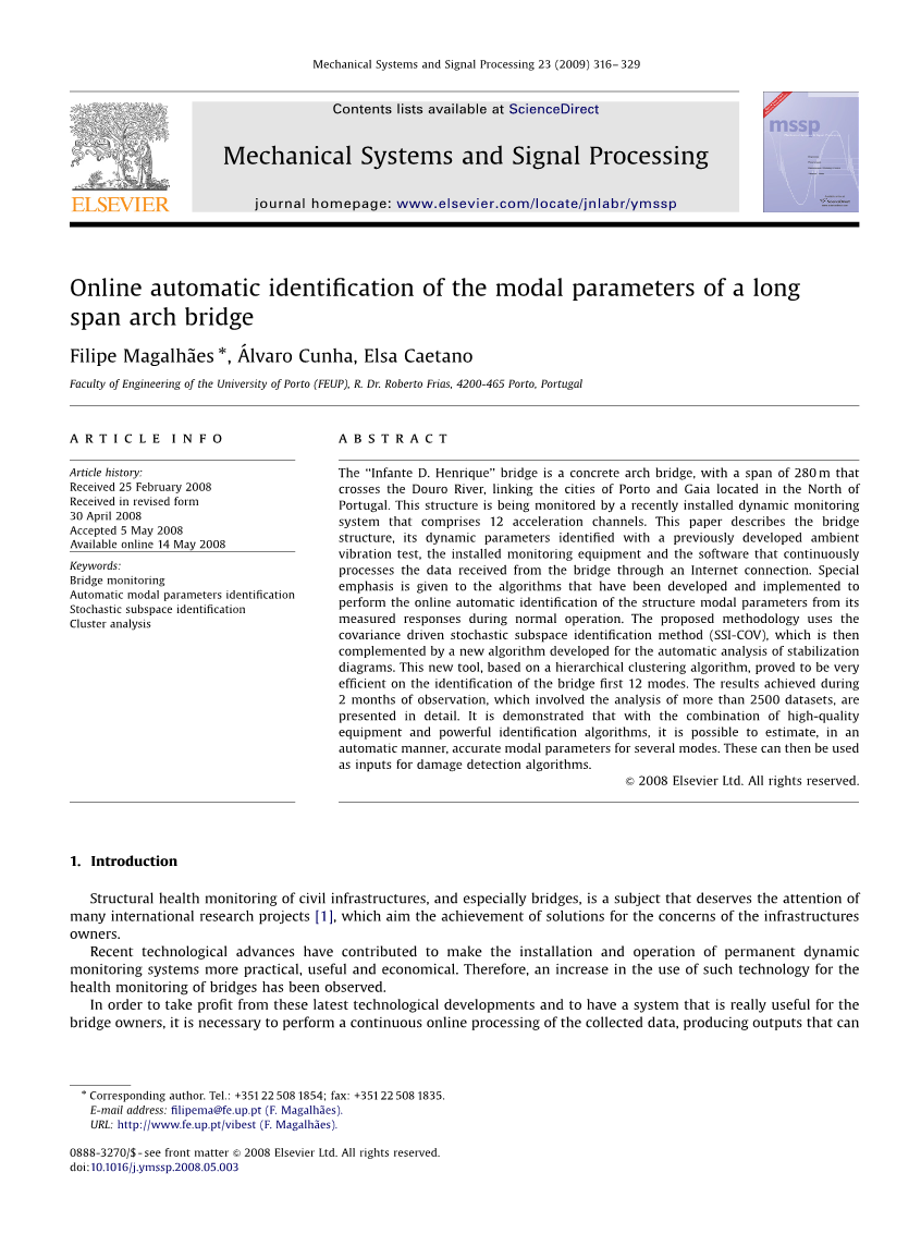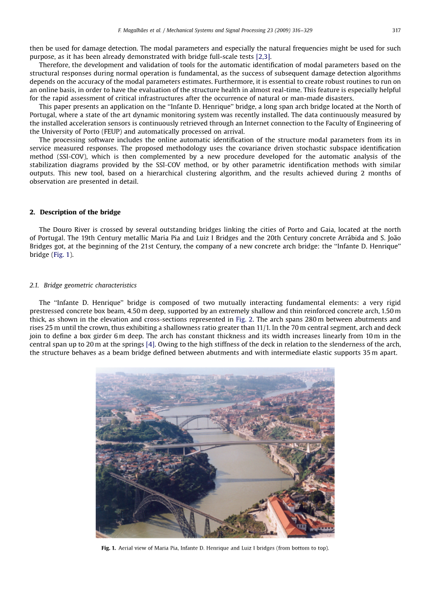 本文提出的“Infante D.Henrique”桥,是一座位于葡萄牙的大跨度拱桥,那里的艺术动态监测系统最近安装了北方的应用程序。加速传感器连续测量的数据通过因特网连接到波尔图大学工程学院(FEUP),并在到达时自动处理。