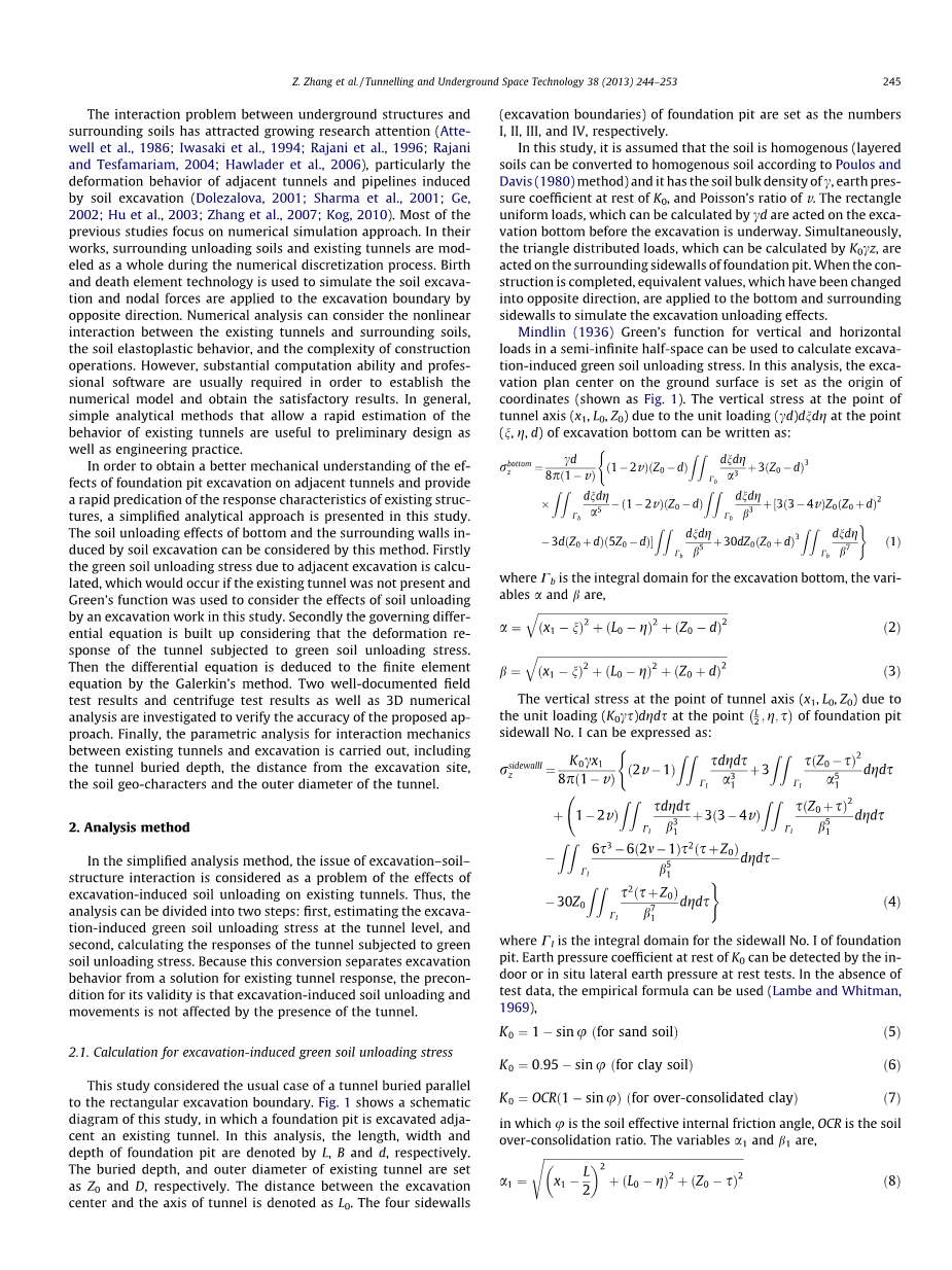 本研究考虑了平行埋入隧道的常见情况到矩形挖掘边界。图1显示了一个示意图这项研究的图表,其中一个基坑被挖出相邻现有的隧道。在这个分析中,长度,宽度和基坑深度分别用L,B和d表示。设置现有隧道的埋深和外径分别为Z0和D.挖掘之间的距离中心,隧道轴线表示为L0。四个侧壁(挖掘边界)作为数字I,II,III和IV。在这项研究中,假设土壤是均匀的(分层的按照Poulos和Poul的说法,土壤可以转化为均匀的土壤戴维斯(1980)方法),它具有c土压力的土壤容重K0的静止系数,v的泊松比。矩形均匀的载荷,可以通过cd来计算,对挖掘起作用在挖掘进行之前底部。同时,三角形的分布荷载,可以用K0cz来计算作用于基坑周围的侧壁。施工时已完成,等价值已被更改到相反的方向,施加到底部和周围侧壁模拟挖掘卸载效应。Mindlin(1936)绿色的功能为垂直和水平可以使用半无限半空间中的荷载来计算挖掘引起的绿色土壤卸载压力。在这个分析中,挖掘在地面上的计划中心被设置为原点坐标(如图1所示)。垂直应力的点隧道轴(x1,L0,Z0)由于单位加载(cd)dndg在该点(n,g,d)可以写成: