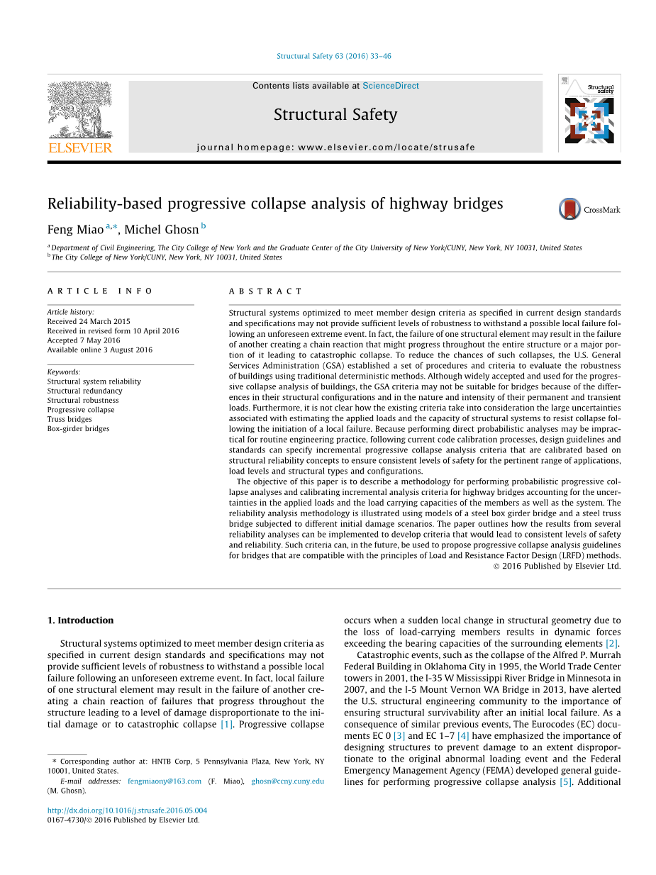 优化以满足现行设计标准和规范中规定的成员设计标准的结构系统,可能无法提供足够的坚固性来抵挡可能发生的局部故障。 这是一个不可预见的极端事件事实上,一种结构元素的失效可能导致另一种结构的失效,从而产生一种链式反应,它可能在整个结构中或主要的部分发生,导致灾难性的坍塌。为了减少这种崩溃的机会,美国总务管理局(GSA)建立了一套程序和标准来评估建筑物的坚固性,使用传统的确定性方法。虽然被广泛接受并用于建筑物的连续倒塌分析,因为它们的结构配置和永久性和瞬态荷载的性质和强度的差异,GSA标准可能不适合桥梁。此外,目前尚不清楚现有的标准是如何考虑到与估算应用荷载和结构系统抗倒塌能力相关的巨大不确定性来降低局部故障发生的。因为执行直接概率分析对于常规工程实践可能是不切实际的,遵循当前的代码校准过程,设计指南和标准可以指定基于结构可靠性CONC校准的增量渐进倒塌分析标准。EPTS,以确保适用范围的安全性,适用范围的应用,负载水平和结构类型和配置。