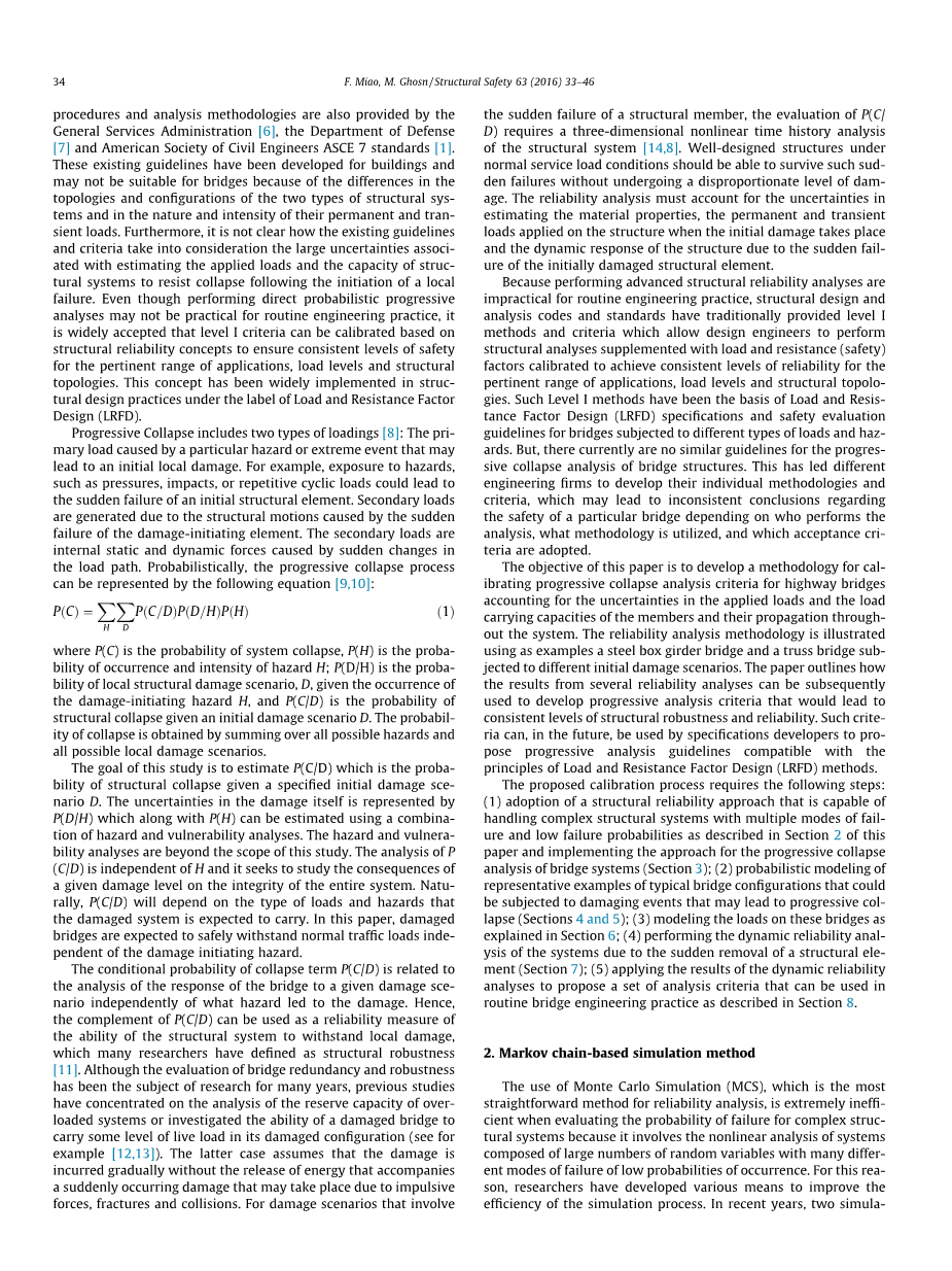 本研究的目的是估计P(C/D),即在给定的初始损伤情景下,结构发生倒塌的概率D。损伤本身的不确定性用P(D/H)来表示。 )与P(H)一起使用危险和脆弱性分析相结合的方法来估计。危险和脆弱性分析超出了本研究的范围。P(C/D)的分析 它独立于H,并试图研究某一损害程度对整个系统完整性的影响。自然,P(C/D)将取决于受损的货物和危险的类型。 系统预计将携带。本文认为,桥梁的损伤是不受损伤引发危险影响的,可以安全地承受正常的交通荷载。