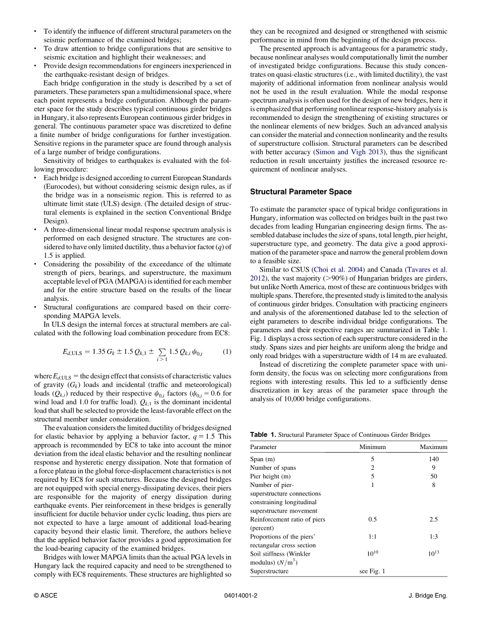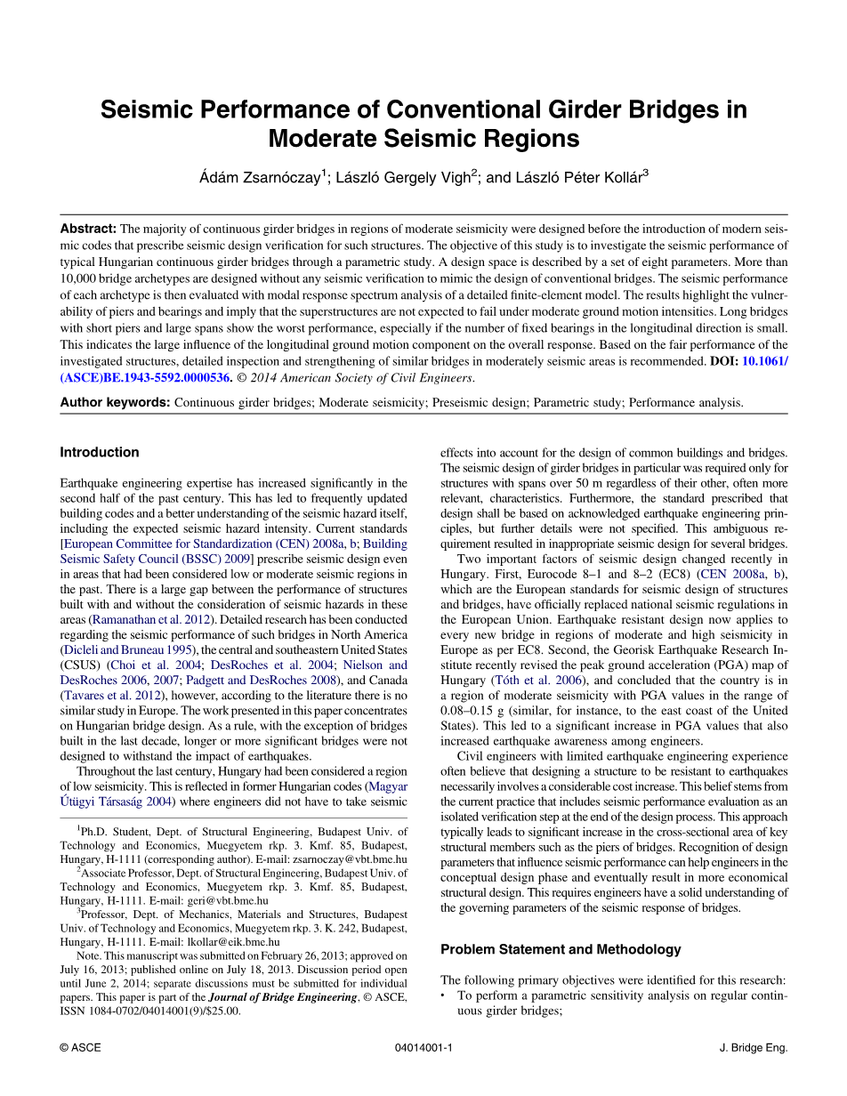 地震工程专业知识在上个世纪的下半年显着增加。这导致了经常更新的建筑规范以及对地震危险本身的更好理解,包括预期的地震危险强度。现行标准[欧洲标准化委员会(CEN)2008a, b; 建筑地震安全委员会(BSSC)2009]即使在过去被认为是低或中等地震区域的地区也规定了抗震设计。在这些区域中考虑地震危险和不考虑地震危险的情况下,建筑物的性能之间存在很大差距(Ramanathan等人2012)。有关北美洲这些桥梁的抗震性能的详细研究(Dicleli和Bruneau 1995年),美国中部和东南部(CSUS)(Choi等人2004年; DesRoches等人2004年; 尼尔森和 DesRoches 2006, 2007; Padgett和DesRoches 2008)和加拿大(塔瓦雷斯等人2012),但是,根据文献,欧洲没有类似的研究。本文介绍的工作集中在匈牙利的桥梁设计。通常情况下,除了过去十年建造的桥梁之外,更长或更重要的桥梁不能承受地震的影响。