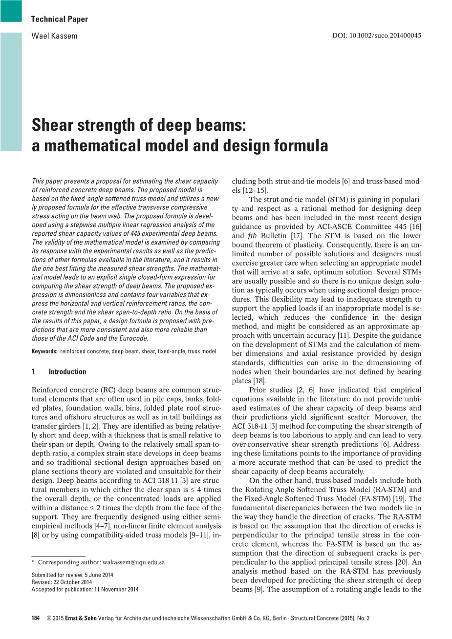 先前的研究[2,6]表明,文献中提供的经验公式不能对深梁抗剪能力进行无偏估计,并且其预测结果会产生显著的分散。 此外,用于计算深梁抗剪强度的ACI 318-11 [3]方法太难以应用,并且可能导致剪切强度预测结果过于保守[6]。为解决这些局限性,提供更精确的方法就显得更为重要,这种方法可以准确地预测深梁的剪切能力。