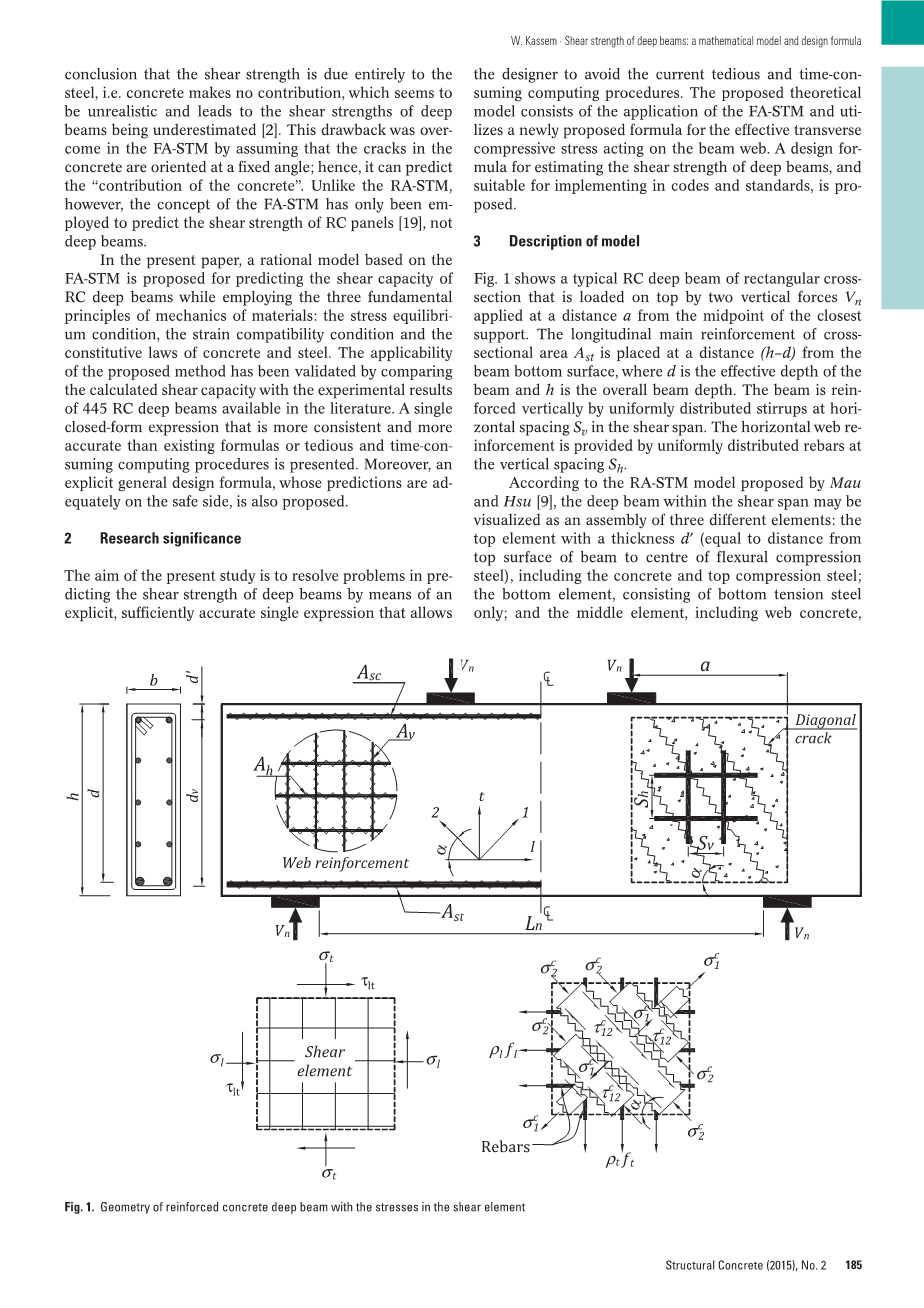 另一方面,基于桁架的模型包括旋转角度软化桁架模型(RA-STM)和固定角度软化桁架模型(FA-STM)[19]。 两种模型之间的根本差异在于它们处理裂纹方向的方式。 RA-STM假设裂缝方向垂直于混凝土构件主拉应力,而FA-STM假设后续裂缝的方向垂直于施加的主拉应力[20]。 之前已经开发了基于RA-STM的分析方法来预测深梁的抗剪强度[9]。通过旋转角度的假设得出的结论是剪切强度完全是取决于钢材,即混凝土没有影响,这似乎是不切实际的,这会导致深梁的剪切强度被低估[2]。 通过假设混凝土中的裂缝以一个固定的角度取向,在FA-STM中克服了这个缺点; 因此,它可以预测“混凝土的影响”。 然而,与RA-STM不同,FA-STM的概念仅用于预测钢筋混凝土板的剪切强度[19],而不是深梁。