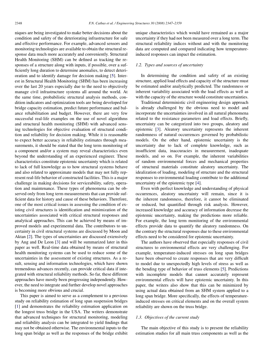 作者发现,特别是土木结构对环境影响的反应非常具有挑战性。例如,观察到大跨度桥梁的温度应力会产生非常难以建模的响应,这是由于意外高水平的应力以及桁架元件的弯曲类型[5]造成的。用不完全模型预测不能准确反映环境影响将会产生认识上的不确定性。在本文中,作者还表明,通过使用SHM系统应用于大跨度桥梁的实际数据,可以将其降至最低。更具体地说,桁架桥上显示了温度引起的应力对关键元件和整个系统可靠性的影响。