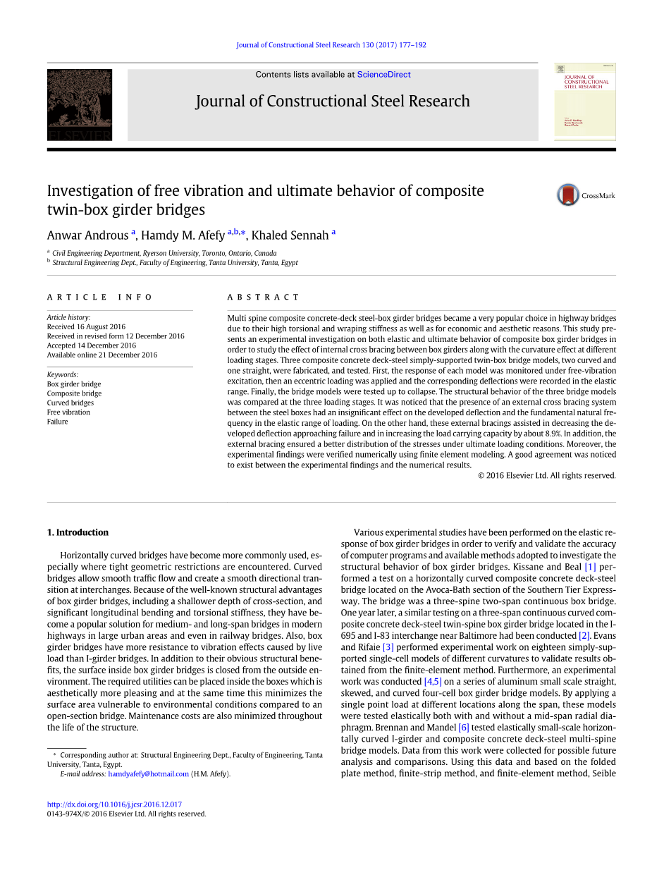 由于其高抗扭刚度以及经济和美学的原因,复合混凝土桥面钢箱梁桥在公路桥梁领域成为一个非常流行的选择。为了研究箱梁内交叉支撑随着不同荷载阶段曲率效应变化的影响,本课题提出了一个研究组合箱梁桥弹性变形和最终的受力情况的预实验。实验制作了三个复合混凝土桥面钢简支双箱桥模型,其中有两个曲线和一个直线模型,并对这些模型进行了测试。首先,对每个模型在自由振动激励下的响应进行了监测,然后在弹性范围内进行偏心加载并记录相应的挠度,最终桥梁模型倒塌,试验结束。在三个加载阶段对三桥模型的结构性能进行了比较。值得注意的是,钢箱之间存在一个外部的交叉支撑系统对已有的挠度和基本的固有频率在载荷作用下的弹性范围影响不大。另一方面,这些外部支撑有助于减小已有的挠度避免结构失效,并使承载能力增加约8.9%。此外,外部支撑确保了在极限荷载条件下应力的更合理分布。 进一步利用有限元模型对实验结果进行了数值模拟,实验结果与数值结果之间有着良好的一致性。