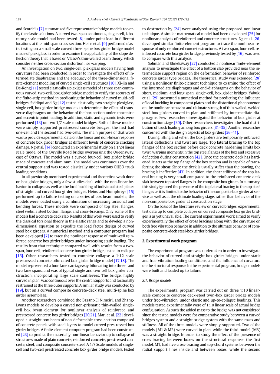 在对曲线桥的文献综述的基础上,对曲线组合箱梁桥完全倒塌的试验数据尚不适用。目前的实验工作旨在验证实验中交叉支撑和曲率对自由振动行为的影响,以及复合混凝土桥面钢箱梁桥的极限状态。
