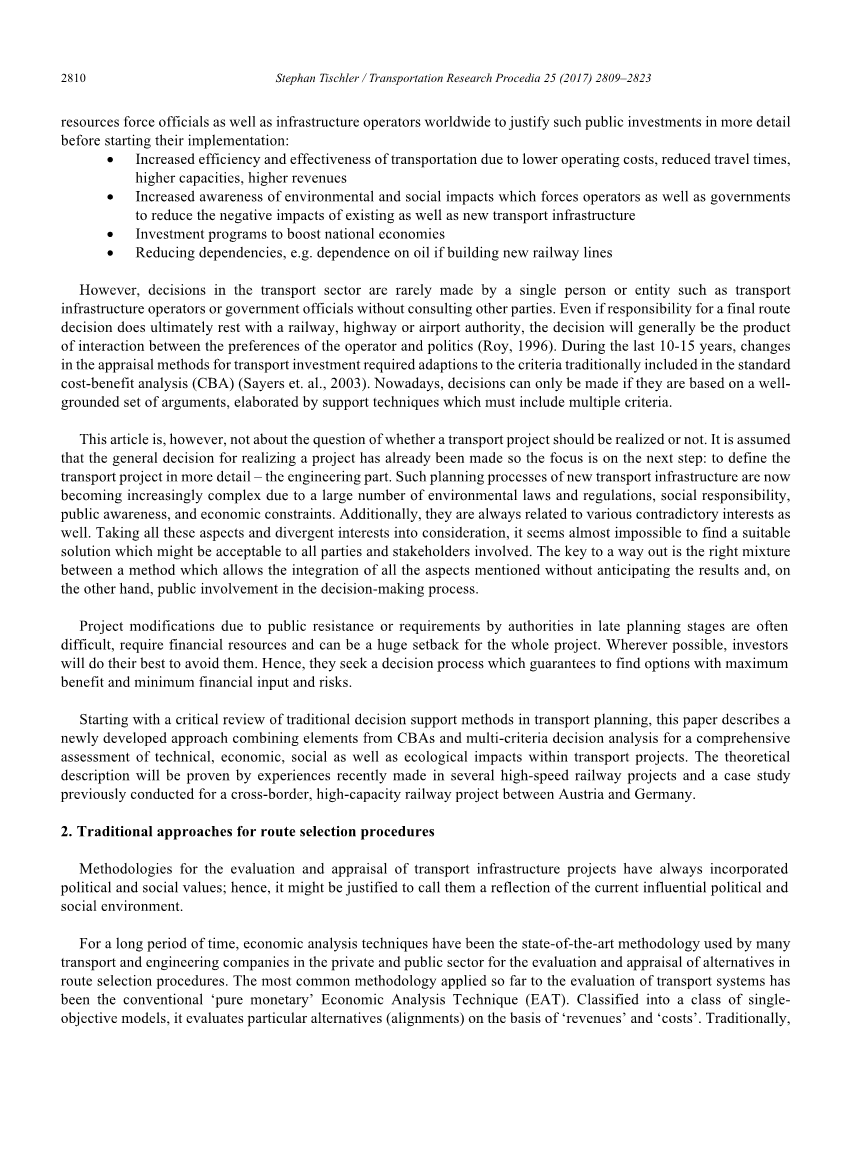 本文从对交通规划中传统决策支持方法的批判性回顾入手,介绍了一种结合CBAs和多标准决策分析的新方法,对交通项目中的技术、经济、社会以及生态影响进行综合评价。这一理论描述将通过最近几项高速铁路项目的经验和在奥地利和德国之间进行的一项跨境高容量铁路项目的案例研究来证明。