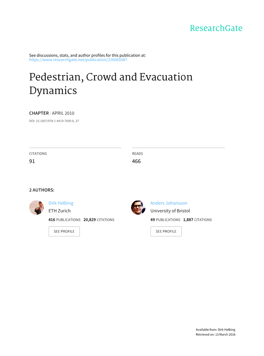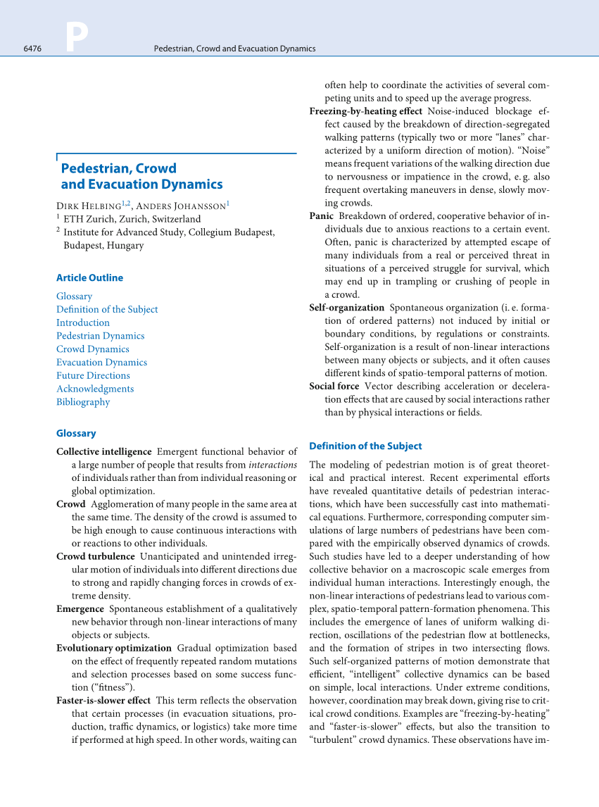 行人运动的建模具有重要的理论和实际意义。最近的实验性工作已经揭示了行人相互作用的定量细节,这些细节已经成功地转化为数学方程。此外,研究大量行人的相应计算机模拟已经与经验观察到的人群动态进行了比较。这样的研究导致了对宏观规模上的集体行为是如何从个体人类相互作用中产生的有一个更深层次的理解。有趣的是,行人的非线性相互作用导致各种复杂的时空模式形成现象。这包括出现一致的行走方向,行人流动在瓶颈处的振荡,以及在两条交叉流动中形成条纹。这些自组织运动模式证明有效的“智能”集体动力学可以基于简单,当地的互动。然而,在极端条件下,协调可能会失败,从而引发关键的人群状况。例子有“加热冻结”和“更快更慢”的影响,但也是向“动荡”的人群动态过渡。 这些观察对行人设施的优化具有重要意义,特别是对于疏散情况。