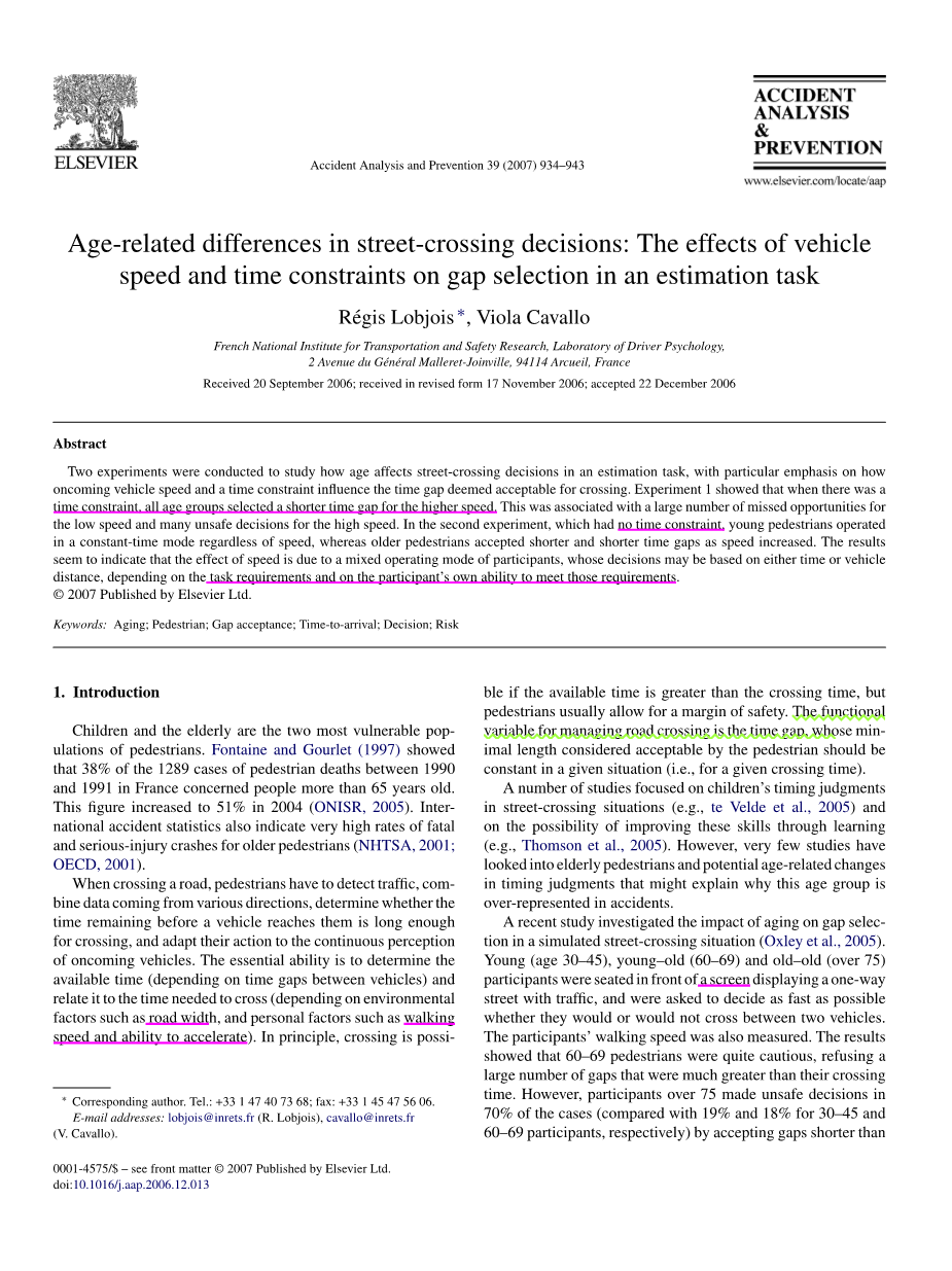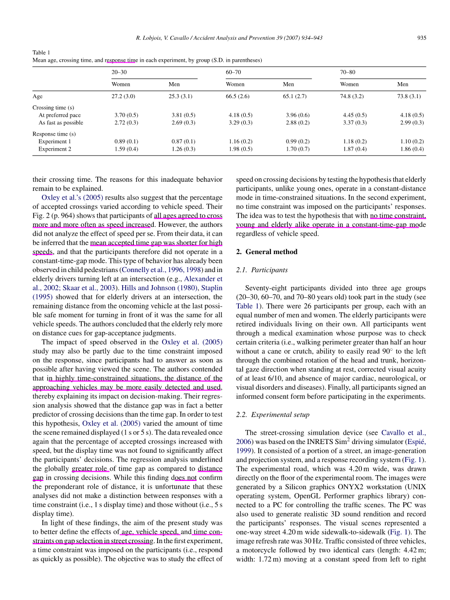 一些研究侧重于儿童在过街情况下的时间判断(例如,te Velde等人, 2005) 以及通过学习提高这些技能的可能性(例如,汤姆森等人,2005). 然而,很少有研究调查了老年行人和可能与年龄有关的时间判断变化,这可能解释了为什么这个年龄组在事故中的比例过高。