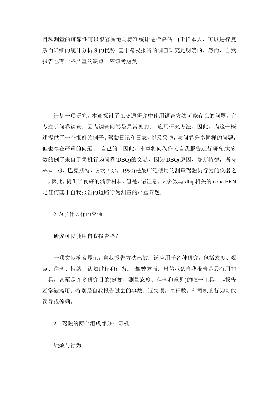 planning a study. This chapter discusses the possible problems in using survey methods in traffic research. It concentrates on questionnaire studies because the survey questionnaire is the most often applied research method and, thus, a good example for this overview. Driving diaries and logs, as well as interviews, share the same problems with questionnaires but also have serious problems of their own. Therefore, this chapter concentrates on questionnaires as self-reports. Most of the examples are from Driver Behaviour Questionnaire (DBQ) literature because the DBQ (Reason, Manstead, Stradling, Baxter, amp; Campbell, 1990) is one of the most widely used instruments for measuring driver behaviors and, thus, provides good demonstration material. Note, however, that most of the DBQ-related concerns are serious problems of any road behavior measure based on self-reports.