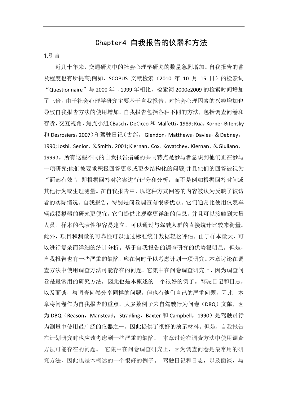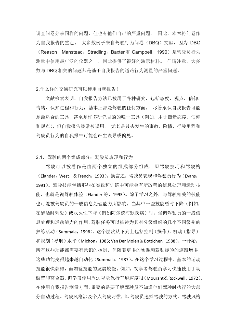 Self-reports and especially questionnaires have many advantages. They are usually less expensive than studies using an instrumented vehicle or a simulator, they provide more detailed information than observations, and they can reach large numbers of people. Representativeness of the sample is easy to establish and can be measured with direct statistical comparisons to driver populations. Moreover, the reliability of items and measurements can be easily eval- uated with standard statistics. Due to large samples, complicated and detailed statistical analyses can be con- ducted. The advantages of self-report-based survey studies are clear. However, self-reports also have some serious shortcomings that should be taken into account when planning a study. This chapter discusses the possible problems in using survey methods in traffic research. It concentrates on questionnaire studies because the survey questionnaire is the most often applied research method and, thus, a good example for this overview. Driving diaries and logs, as well as interviews, share the same problems with questionnaires but also have serious problems of their own. Therefore, this chapter concentrates on questionnaires as self-reports. Most of the examples are from Driver Behaviour Questionnaire (DBQ) literature because the DBQ (Reason, Manstead, Stradling, Baxter, amp; Campbell, 1990) is one of the most widely used instruments for measuring driver behaviors and, thus, provides good demonstration material. Note, however, that most of the DBQ-related concerns are serious problems of any road behavior measure based on self-reports.