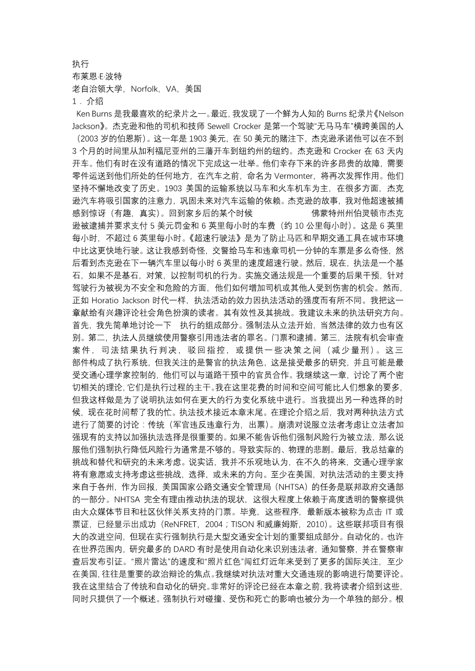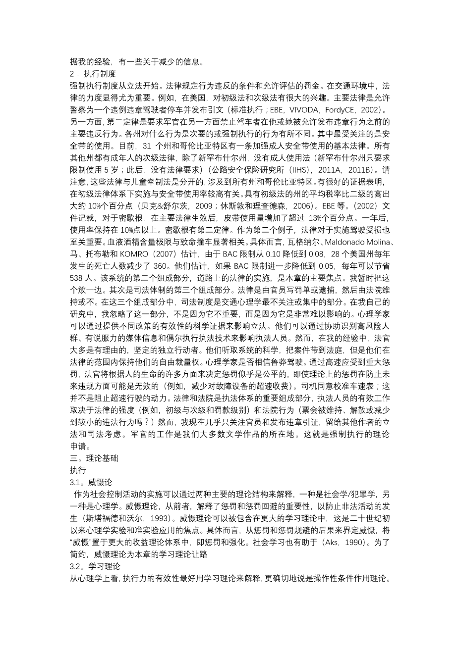 Enforcement Bryan E. Porter Old Dominion University, Norfolk, VA, USA 1. INTRODUCTION Ken Burns is one of my favorite documentarians. Recently, I discovered a lesser known Burns’ documentary profiling Horatio Nelson Jackson. Jackson and his driver and mechanic, Sewell Crocker, were the first to drive “the horseless carriage” across the United States (Burns, 2003). The year was 1903, and on a $50 wager, Jackson promised he could drive from San Francisco, California, to New York City, New York, in less than 3 months. Jackson and Crocker made the drive in 63 days. They accomplished this feat at times without roads to drive on. They survived numerous and costly breakdowns that required parts to be shipped to wherever they happened to be before the automobile, named the Vermonter, would function again. They persevered and changed history. The United States’ transportation system in 1903 was dominated by horse-drawn carriages and train locomotives. Due in many ways to Jackson, the automobile would capture the country’s attention and solidify the future’s reliance on automobile transportation. In addition to being fascinated with Jackson’s tale, I was surprised (and amused, truthfully) about his arrest for speeding. Sometime after returning to his home town of Burlington, Vermont, Jackson was arrested and required to pay a $5 fine and court costs for driving 6 mph (approximately 10 kph). This was 6 mph itself, not 6 mph over the limit. The speeding law was written to prevent horses and earlier forms of transportation from moving faster than this in an urban environment. It made me wonder how strange it must have been for traffic police to give tickets for horseand-carriage violators one minute and then see Jackson speeding by at 6 mph in an automobile the next. Then, as now, enforcement is a cornerstone, if not the cornerstone, countermeasure to control driver behavior. Enforcing traffic laws is an important consequence intervention targeting driving behaviors deemed unsafe and risky in terms of how they increase the chances for the driver or others to be harmed. Yet, just as in Horatio Jackson’s time, enforcement’s effectiveness varies by the strength of the law enforcement activities. I offer this chapter to readers interested in reviewing the role enforcement plays in society, both its effectiveness and its challenges. I suggest future directions for enforcement studies. First, however, I open with a brief discussion of the components of enforcement. Enforcement begins with legislation, and it is certainly true that the strength of the law makes a difference. Second, enforcement continues with police officers using the law to cite violators with tickets and arrests. Third, courts have opportunities to review cases, with judicial outcomes carrying out the sentences, dismissing the charges, or providing some decision in between (reduced sentencing). These three components make up the enforcement system, but I focus on the officer enforcement role, which has received the most study and is probably the most controlled by traffic psychologists, who can partner with officers in roadway interventions. I continue the chapter with a discussion of the two theoriesdclosely relateddthat are the backbone of the enforcement process. I spend more time and space here than perhaps one would think, but I do so to show how enforcement fits within a larger system of behavior change. Taking time now actually helps me when I suggest an alternative enforcement technique near the end of the chapter. After the theoretical introduction, I proceed with a brief discussion of two types of law enforcement: traditional (officer pulling a violator over to issue a ticket) versus automated. Perhaps the most studieddand sometimes contesteddarea of enforcement throughout the world is the use of automation to identify violators, notify police, and issue citations after police review. “Photo radar” for speed and “photo red” for red light running have received more international attention in recent years and, at least in the United States, are often the focus of significant political debate. I continue with brief reviews of enforcement’s impact on key traffic violations. I combine traditional and automated research here. Very good reviews have preceded this chapter, and I refer readers to these while providing only an overview. The impact of enforcement on crashes, injuries, and fatalities is considered in a separate section, too. In my experience, having some information about reductions in crashes is important for convincing lawmakers to consider making lawsdor strengthening existing onesdto enhance enforcement options. Persuading them that enforcement reduces a risk behavior is often insufficient if one cannot show them that the risk behavior to be legislated against