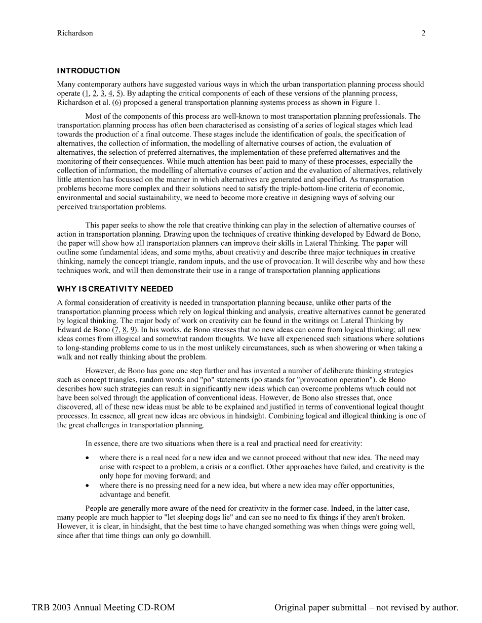 在交通规划中需要对创造性进行正式的考虑,因为与依靠逻辑思维和分析的交通规划过程的其他部分不同,创造性的替代方案不能由逻辑思维产生。创造性的主要工作可以在爱德华·德·波诺的横向思维写作中找到(7, 8, 9)。在他的著作中,de Bono强调逻辑思维不会产生新的想法,所有新的想法来自不合逻辑和有点随意的想法。我们都经历过这样的情况:在最不可能的情况下,我们解决了长期存在的问题,比如淋浴或散步时,并没有真正思考问题。