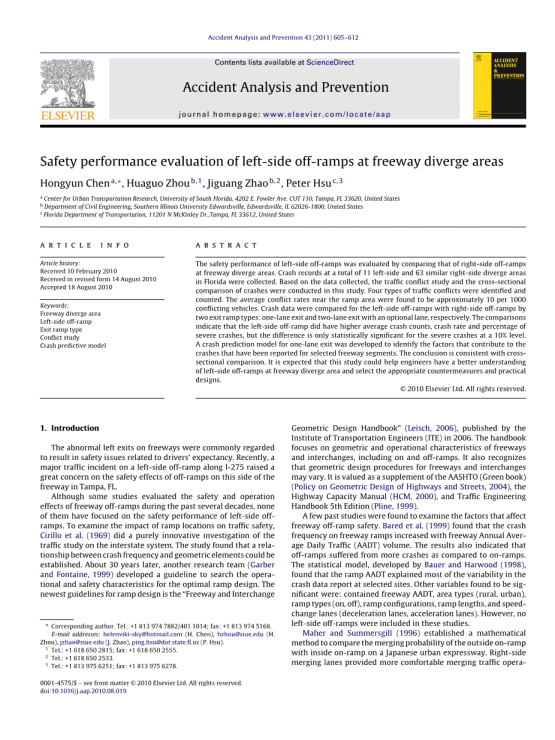 高速路上不常见的左侧出口匝道形式通常被认为是导致与驾驶员期望有关的安全问题的原因,最近,在佛罗里达州坦帕市的I-275高速公路段左侧出口匝道发生的一起重大交通事故引起了人们对这一形式出口匝道安全性的极大关注。