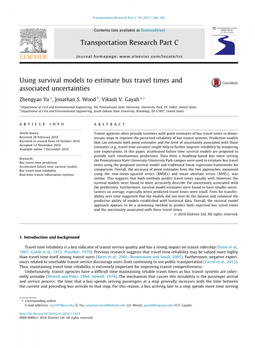 生存模型和线性模型结构都被应用在从宾夕法尼亚州立大学的交通机构获得的数据中。该数据集代表了大量的实时数据样本,这些数据通过AVL和APC系统等新技术越来越多地向运输机构提供。结果的比较发现,线性和生存模型在期待公交车行程时间估计方面表现相近,即,他们在预测公交车行程时间方面表现都一样好。然而,生存模型的错误方面的增加的流动性使它比同时使用线性回归模型提供了更加准确的量化的不确定性。此外,从生存模型获得的不确定性往往比使用线性回归预测的更小。这些结果说明,生存模型可以被用来提供给乘客更高质量的公交车行程时间信息,这能有助于进一步提高公共交通的可靠性。