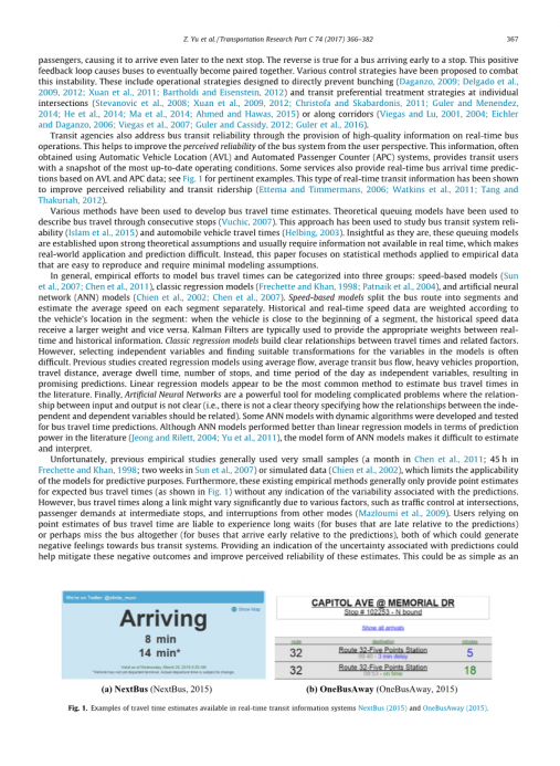 不幸的是,过去的实证研究一般都使用非常小的样本(Chen等, 2011,使用样本时间为一个月;Frechette and Khan, 1998,使用时间为45小时;Sun等, 2007,使用时间为两周),这限制了模型对未来目标的可适用性。此外,这些现有的经验方法通常仅提供关于预期公交车行驶时间的点估计(如图1所示),没有任何与预测相关的变量的暗示。然而,连续行驶的公交车行程时间也许会因为不同的因素变化很大,比如交叉口交通控制,中间站的乘客需求,以及其他模型的干扰(Mazloumi等, 2009)。依赖于对公交车行程时间进行点估计的使用者能等待更长的时间(对于相对于预测迟到的公交车),或者完全错过公共汽车(对于相对于预测更早到达的公交车),两种情况都会产生对公交车交通系统的不好的使用体验。提供与预测相关的不确定性的指示可以帮助减轻这些负面结果并提高这些估计的感知可靠性。这可以变得很简单,比如预示行程时间估计有多少可靠性(比如非常可靠或者不是非常可靠),或者是具体的东西比如提供行程时间估计的下限和上限(即置信区间)。
