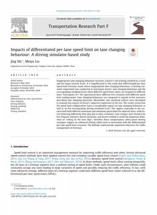 关键词:每车道速度限制差异;车道变换;驾驶行为;驾驶工作量;NASA-TLX;驾驶模拟器;