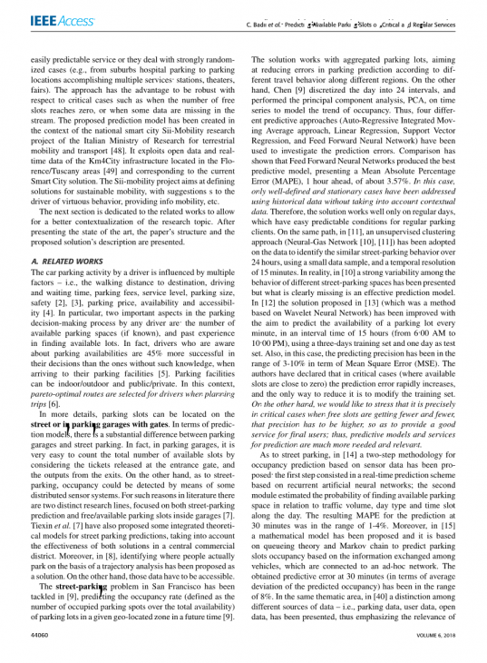 开放数据,提供一个独立和可持续的系统,以搜索街道上的停车位。因此,Pflugler等人[40]提出了-种基于神经网络的预测模型,MSE为16%,没有考虑非平稳态度下停车位的临界情况。在[46]中,研究了停车数据、行人数据和汽车交通数据的使用情况,以预测墨尔本市15分钟间隔的可用街道停车情况。