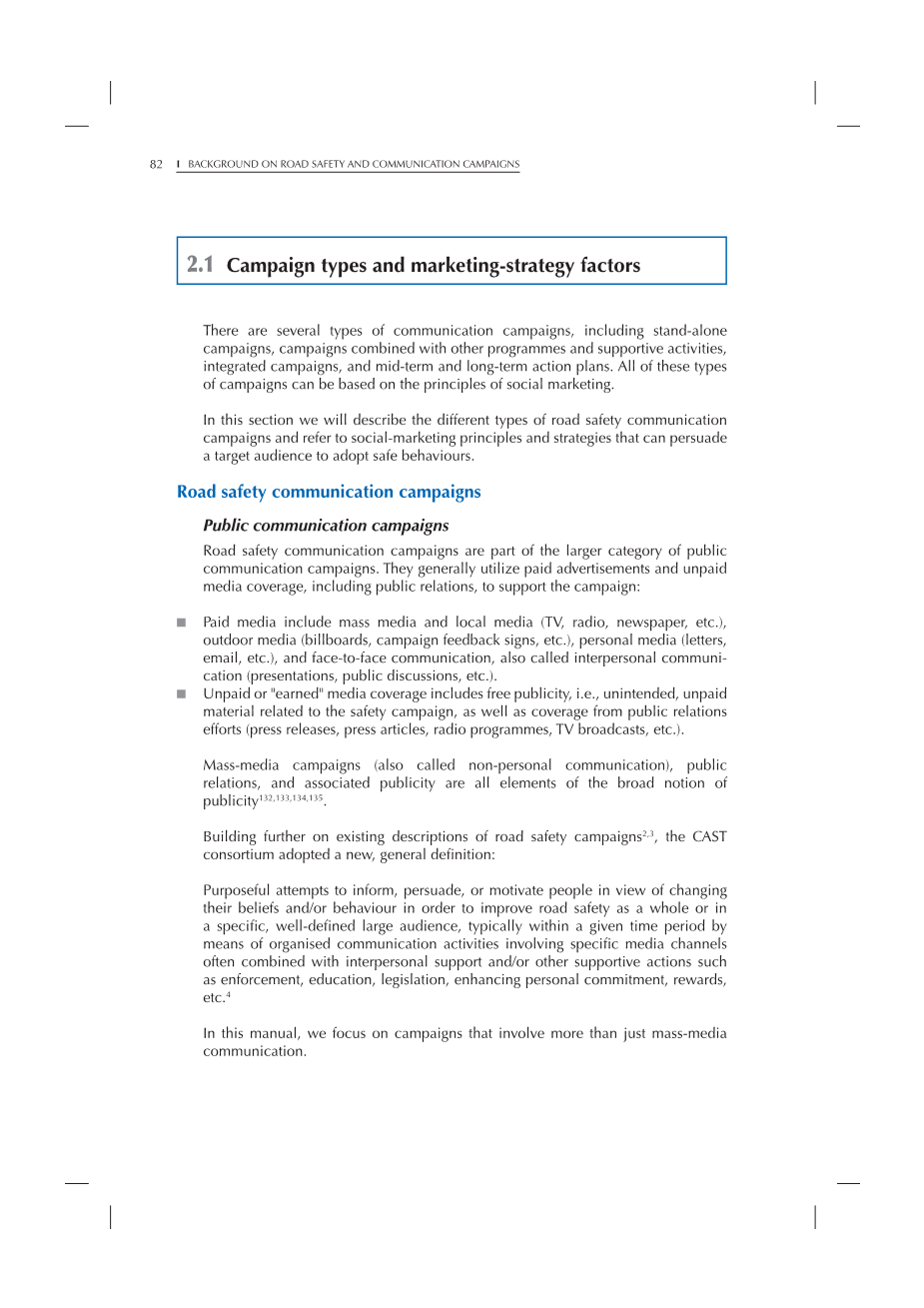 在本节中,我们将描述各种类型的道路安全宣传活动,并参考可以说服目标受众采用安全行为的社会营销原则和策略。