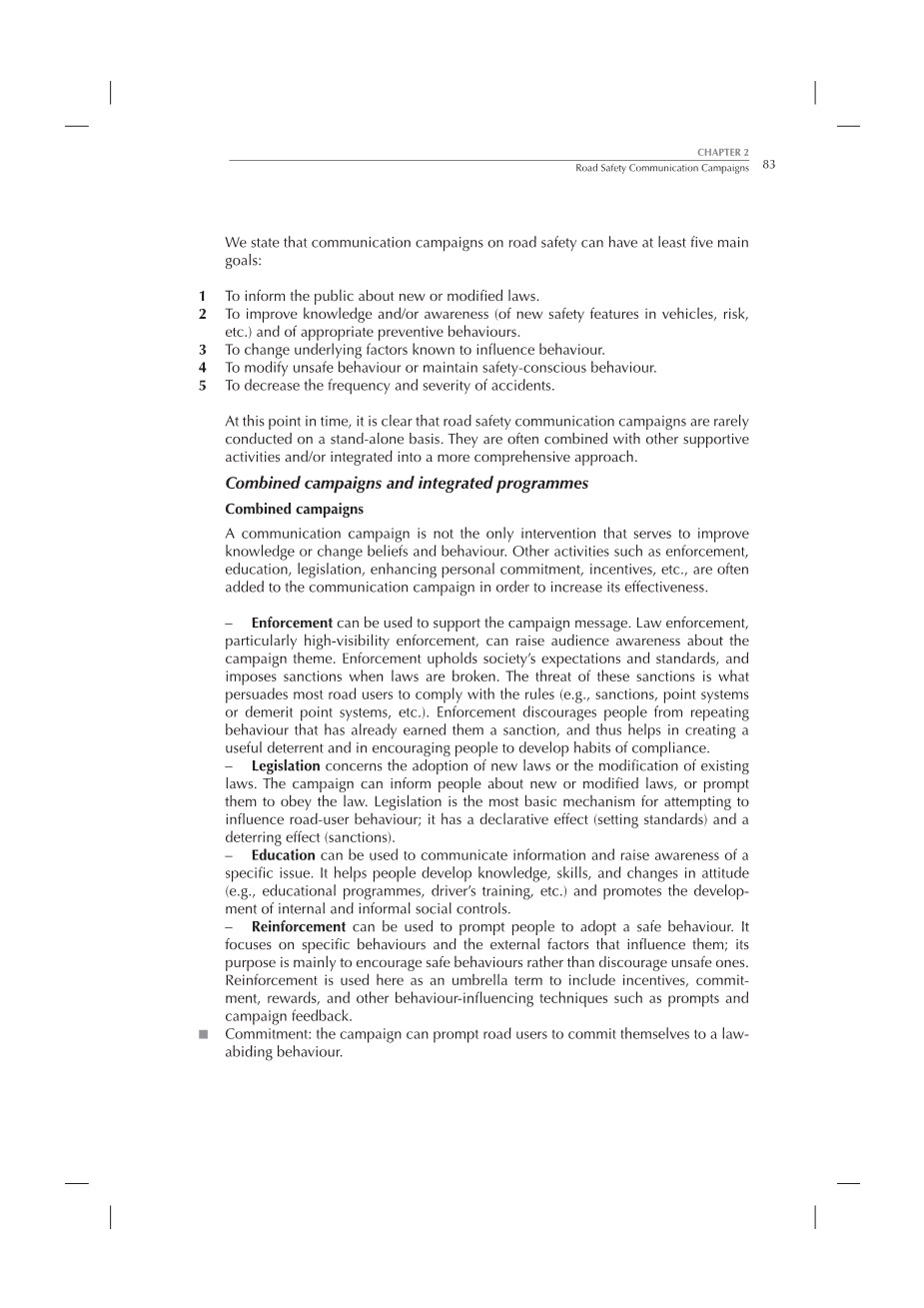 2)立法涉及通过新法律或修改现有法律。该运动可以使人们了解新法律或修改过的法律,或促使他们遵守法律。立法是试图影响道路使用者行为的最基本机制。它具有声明作用(制定标准)和阻止作用(制裁)。