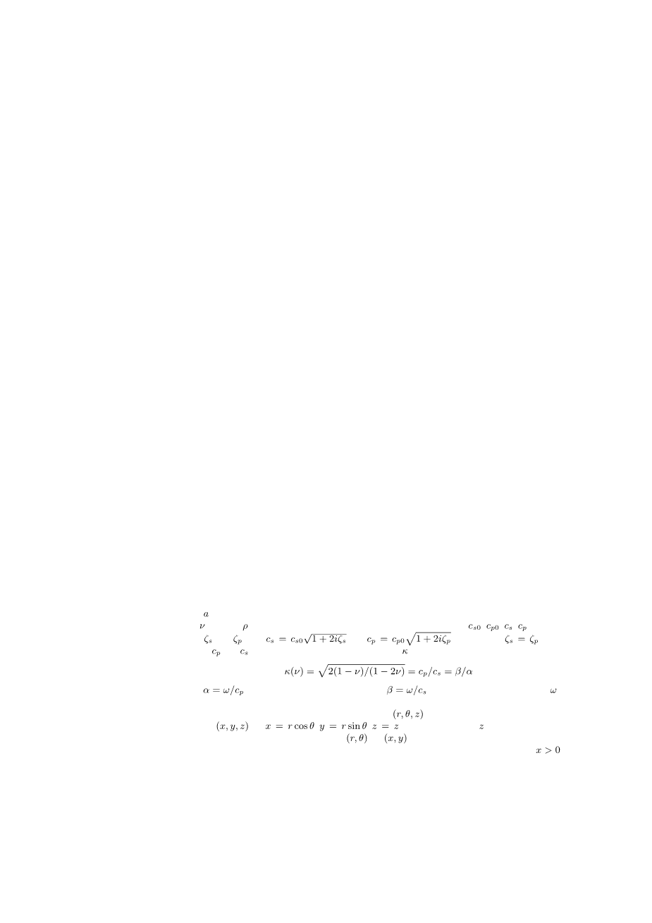 以下研究使用柱坐标(r,theta;,z),通过x=r costheta;,y=r sintheta;,z=z与笛卡尔坐标(x,y,z)相关,通过在纵向方向上定位z轴结构方向(图1)。因此,(r,theta;)或(x,y)平面表示结构的横截面。结构受到向上传播(xgt;0)的入射平面波的影响,并且2其入射角为。半径为A的空腔有衬里或有衬里或弹性或流体包裹体与周围介质完美接触。