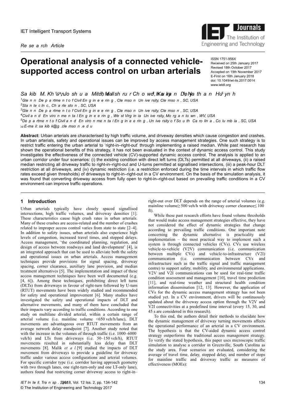 为此,作者详细介绍了他们的方法,以阐明车道转弯运动的动态管理如何影响车辆联网环境中主线车辆的操作性能。假设是车辆联网辅助的动态出入口控制策略优于传统的出入口管理策略,为了验证所述假设,本文将南卡罗来纳州格林维尔的干路作为研究区域,并使用微观交通模拟对该区域进行分析。对四种情况进行了评估,其中考虑了平均行驶时间,延误,停车延误以及干线交通和小区车道交通的停车次数作为有效性度量: