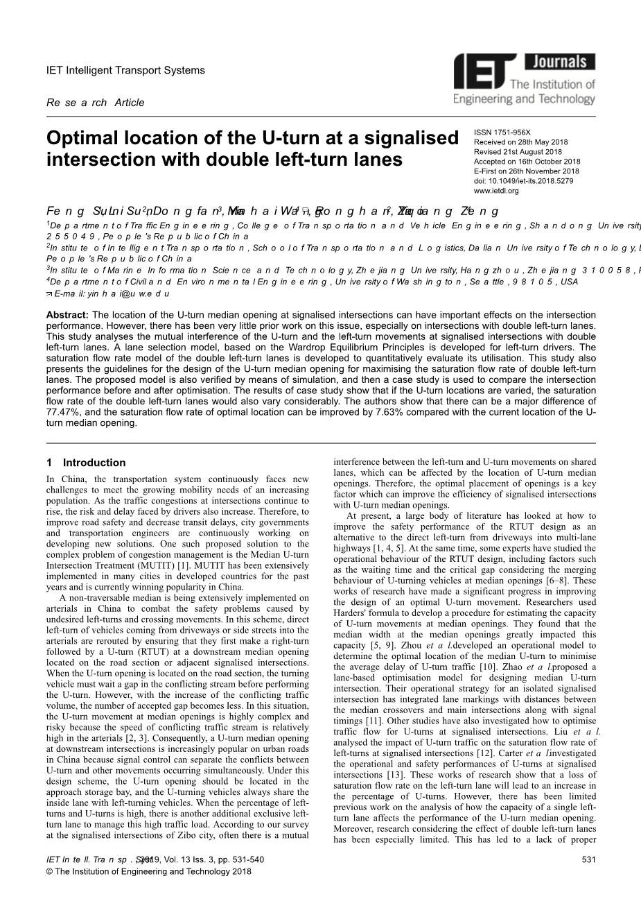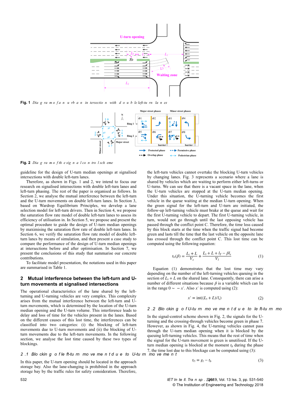 中国正在广泛采用不可穿越的中央分隔带设计,以避免与左转交通产生交叉引起的安全问题。在此方案中,需要从车道或支路直接左转的车辆,通过确保其先在路段的下游中间开口处或相邻信号交叉路口掉头(RTUT),然后再右转实现间接左转。当掉头开口位于路段上时,掉头车辆必须等待冲突流的间隙才能进行掉头。但是随着冲突流量的增加,可接受的间隙数变少。在这种情况下,因为冲突的交通流在主干道中的速度相对较高[2,3],中位开口处的掉头运动变得非常复杂且具有风险。因此,在中国的城市道路上,下游交叉口的掉头需求越来越多,因为信号控制可以分离掉头和同时发生的其他方向交通流之间的冲突。在此设计方案下,掉头开口应位于信号交叉口中,掉头车辆始终与​​左转车辆共享内部车道。当左转和掉头车流占比很高时,还需要一个专用的左转车道来应对这种高交通负荷的需求。根据我们在淄博市信号交叉口的调查,由于受到掉头中间开口位置的影响,共享车道上的左转和掉头车流之间经常存在相互干扰。因此,掉头开口的最佳位置是一个关键因素,可以提高具有U型转弯中间开口的信号交叉口的通行效率。