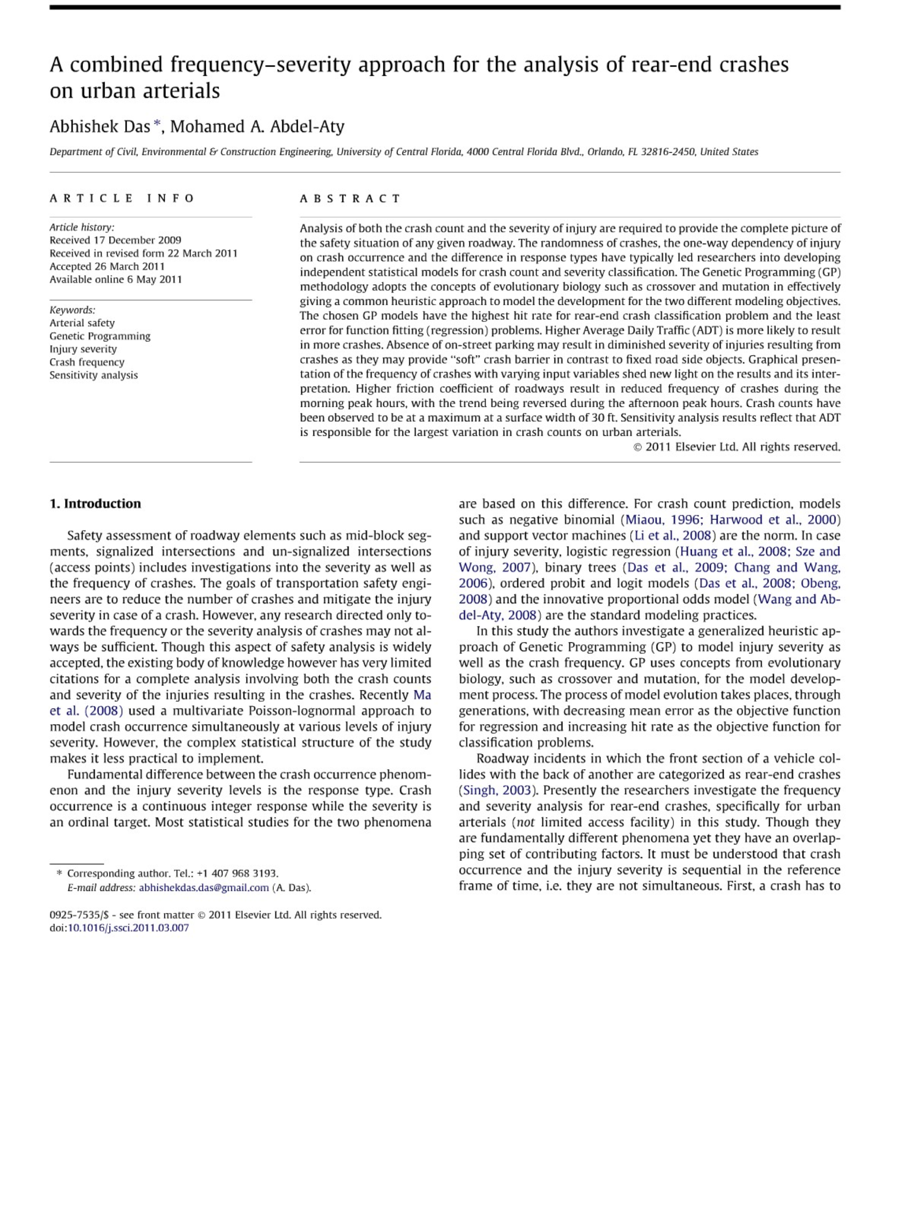 车辆碰撞的前部与另一方的后方发生的车道事故被归类为追尾事故( Singh,203年)。目前,研究人员正在研究追尾事故发生的频率和严重性分析,特别是在这项研究中针对城市动脉(非受限通道设施)的事故。尽管它们在本质上是不同的现象但是它们具有一组相互重叠的影响因素。必须理解的是,碰撞发生和伤害严重程度在参考时间框架内是连续的,即它们不是同时发生的。首先,碰撞必须发生,然后可能导致伤害。因此,两个事件之间存在单向依赖性。作者在这里建议在启发式GP的广泛范围内建立碰撞模型的严重性和频率的独立方法。由于碰撞的发生和伤害的严重程度是不同的现象,因此,没有一个模型来管理它们是不现实的然而。在这项研究中,作者针对这两个事件给出了通用的启发式模型开发过程。必须注意的是,撞车原因是发生与伤害程度之间的联系。不同类型的原因可能会对伤害严重性产生影响。