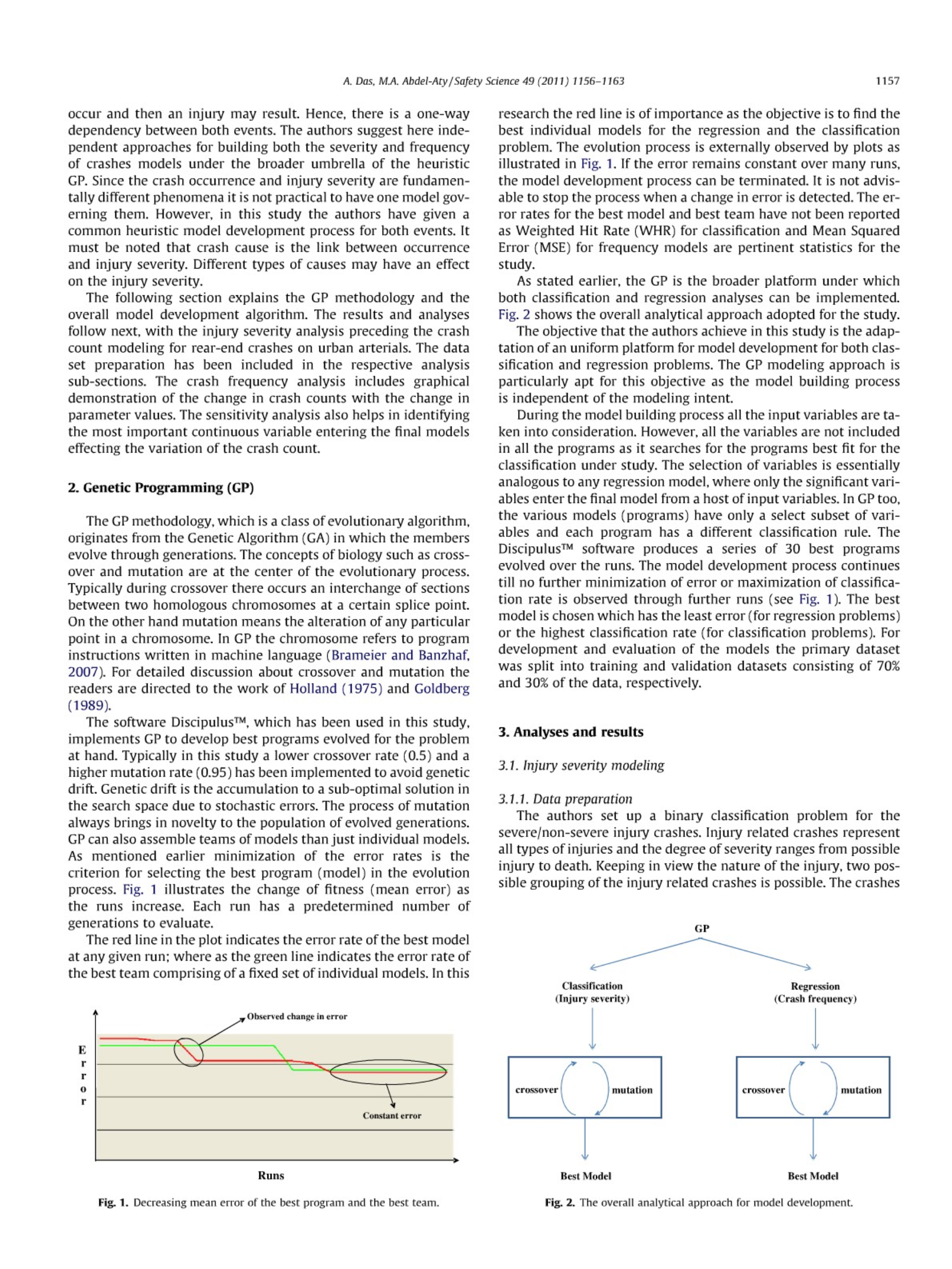在这项研究中,作者研究了遗传算法(GP)刘伤害严重程度和碰撞频率的一般启发式方法。GP将进化生物学的概念(例如交叉和变异)用于模型开发过程。模型演化的过程历经几代人,平均误差的降低是回归的目标函数,命中率的提高是分类问题的目标函数。