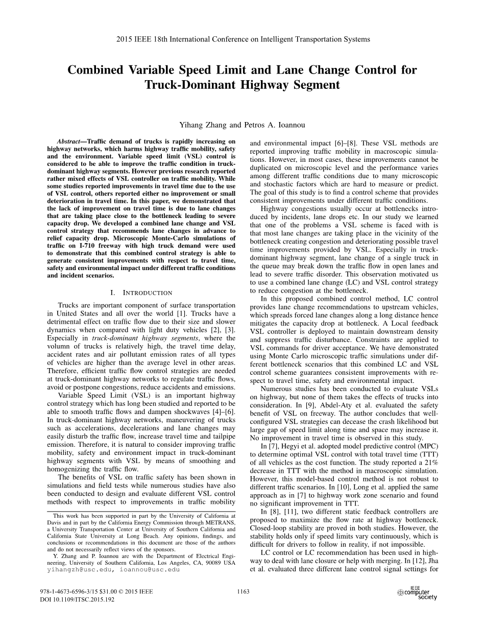 摘要:高速公路网络对卡车的交通需求正在迅速增加,这对公路交通的流动性、安全性和环境造成了损害。变速限制(VSL)控制被认为能够改善卡车主导的高速公路路段的交通状况。然而,以前的研究报告了VSL控制器对交通流动性的混合影响。虽然一些研究报告了由于使用VSL控制而导致的旅行时间的改善,但其他研究报告了旅行时间的改善或小恶化。在本文中,我们证明了行驶时间缺乏改善是由于车道变化发生在瓶颈附近,导致严重的容量下降。我们开发了一种联合车道变更和VSL控制策略,提前推荐车道变更以缓解容量下降。微观的蒙特卡罗模拟I-710高速公路上的交通需求被用来证明这种组合控制策略能够产生关于行驶时间的一致改进,不同交通状况和事件场景下的安全和环境影响。